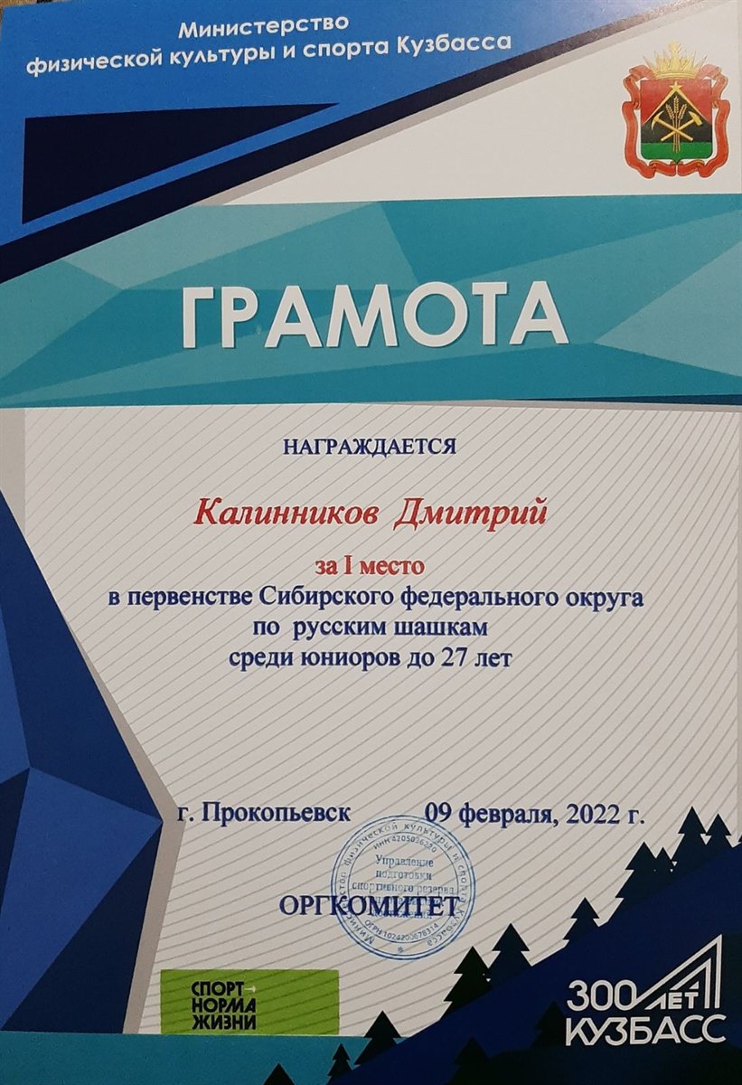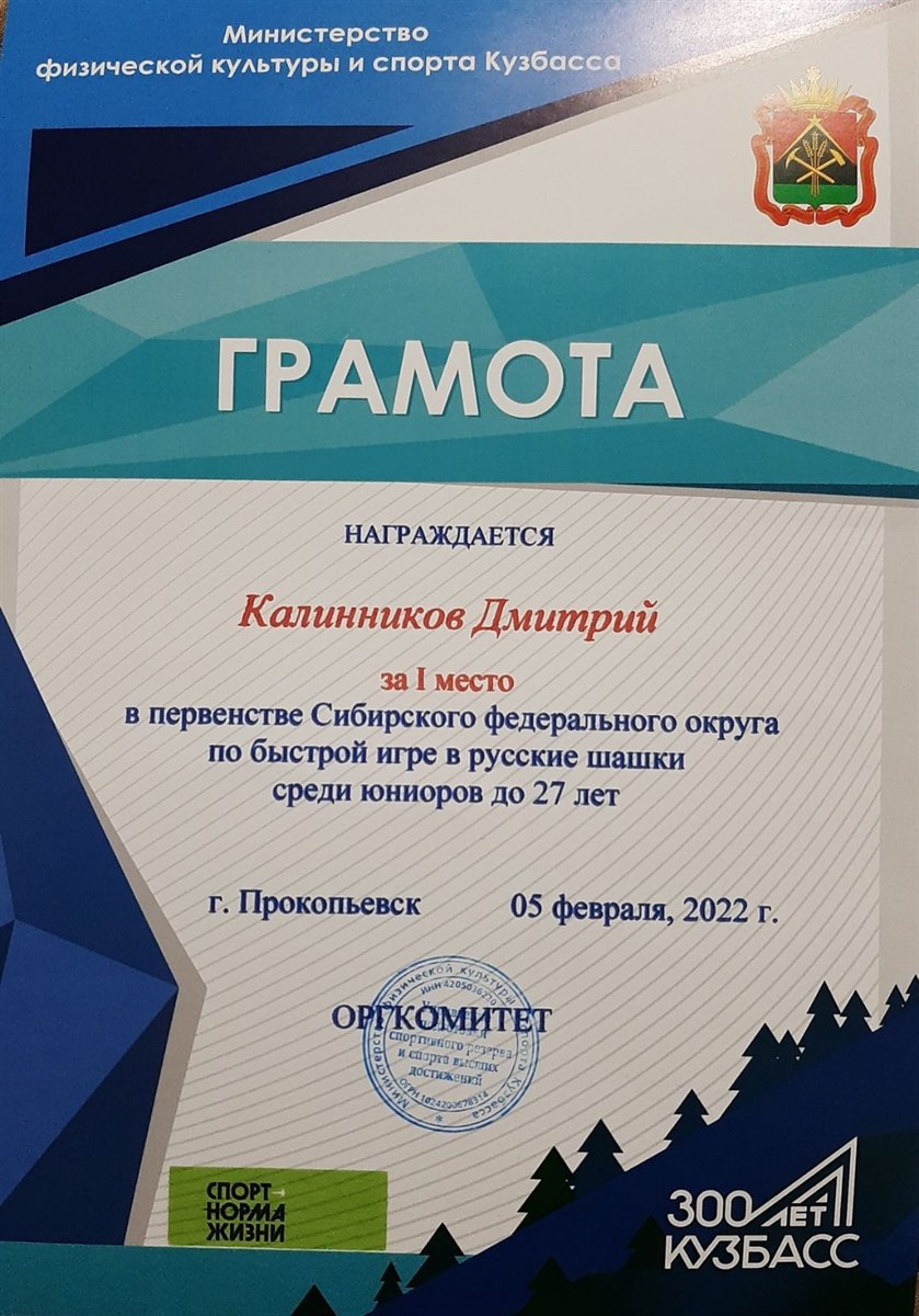С 4 по 10 февраля 2022 г. Прокопьевске (Кемеровская область) встретились самые сильные шашисты Сибири. Здесь прошло первенство Сибирского федерального округа по русским шашкам в шести возрастных группах: среди мальчиков и девочек до 9 лет, среди юношей и девушек до 11, 14, 17 лет, среди юниоров и юниорок до 20, 27 лет. Игра в русские шашки прошла по трем программам: классическая, быстрая, молниеносная. В соревнованиях приняли участие более 70 спортсменов Кемеровской, Омской, Иркутской областей, Красноярского и Алтайского краев.