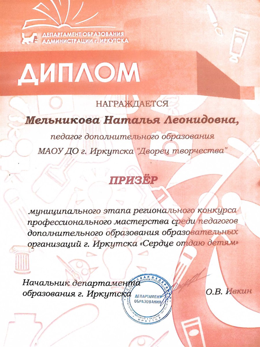 В рамках мероприятий Иркутского форума образования – 2022 «Иркутское образование – время новых инициатив» 10 марта 2022 года проведено награждение победителей и призёров профессиональных конкурсов. Мельникова Наталья Леонидовна, педагог дополнительного образования, стала призёром муниципального этапа Регионального конкурса профессионального мастерства среди педагогов дополнительного образования образовательных организаций г. Иркутска «Сердце отдаю детям»