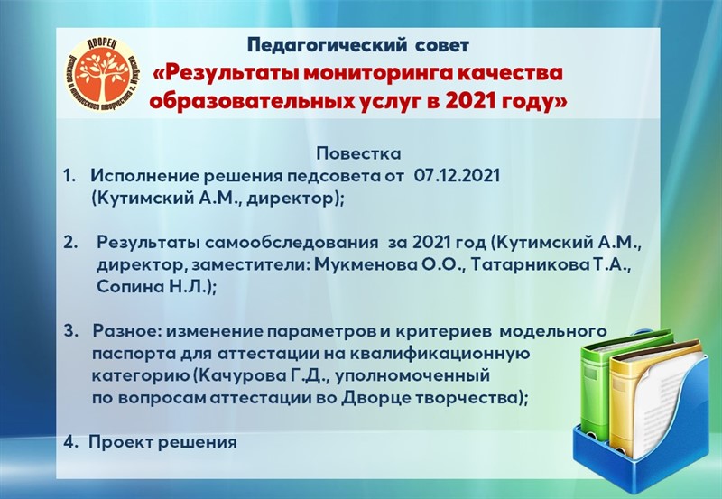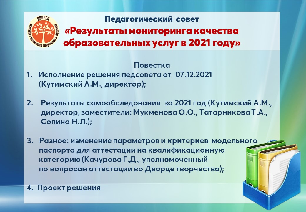 29 марта 2022 года во Дворце творчества прошёл педагогический совет по теме «Результаты мониторинга качества образовательных услуг в 2021 году». Результаты самообследования были представлены директором и заместителями директора
