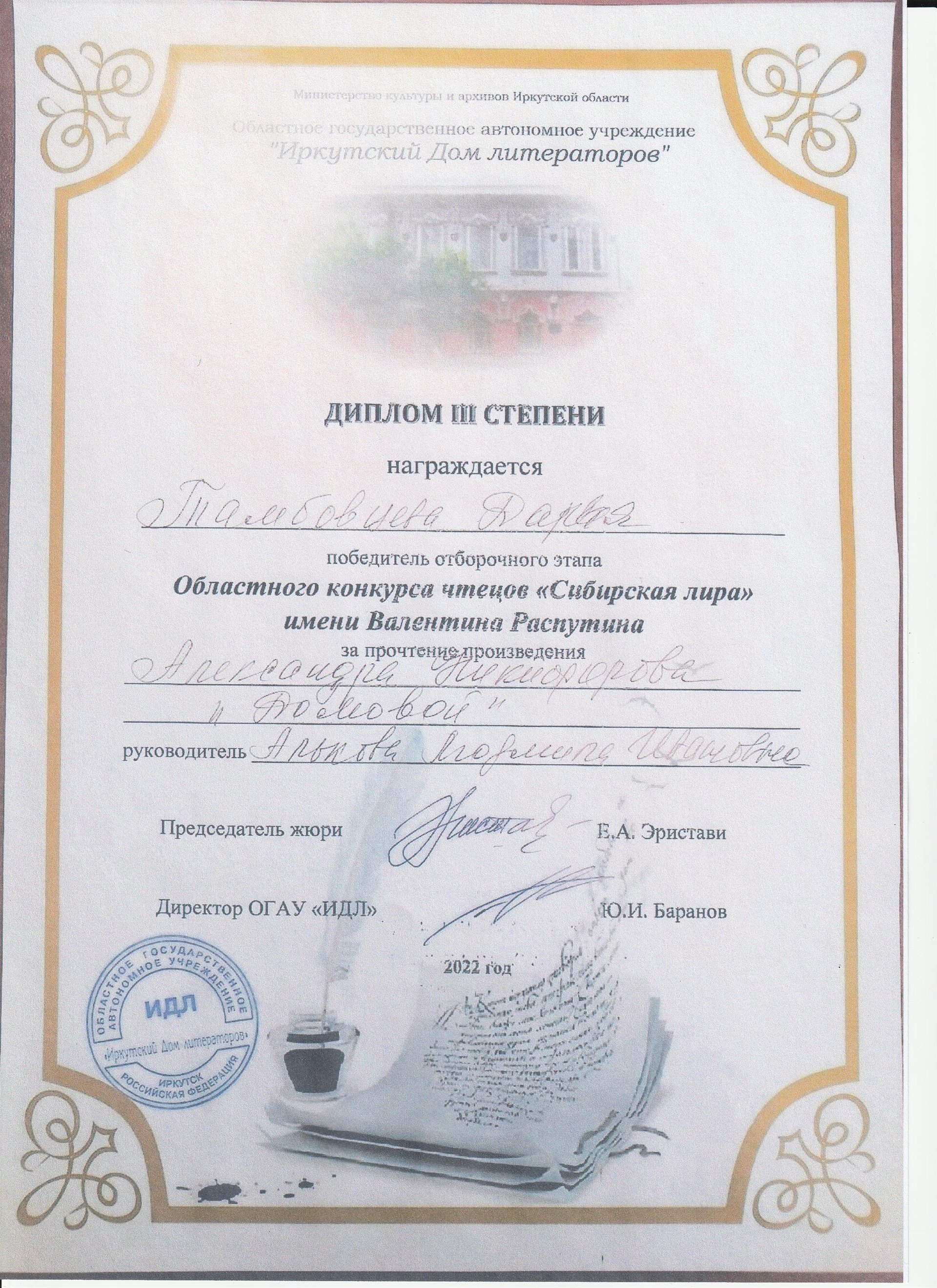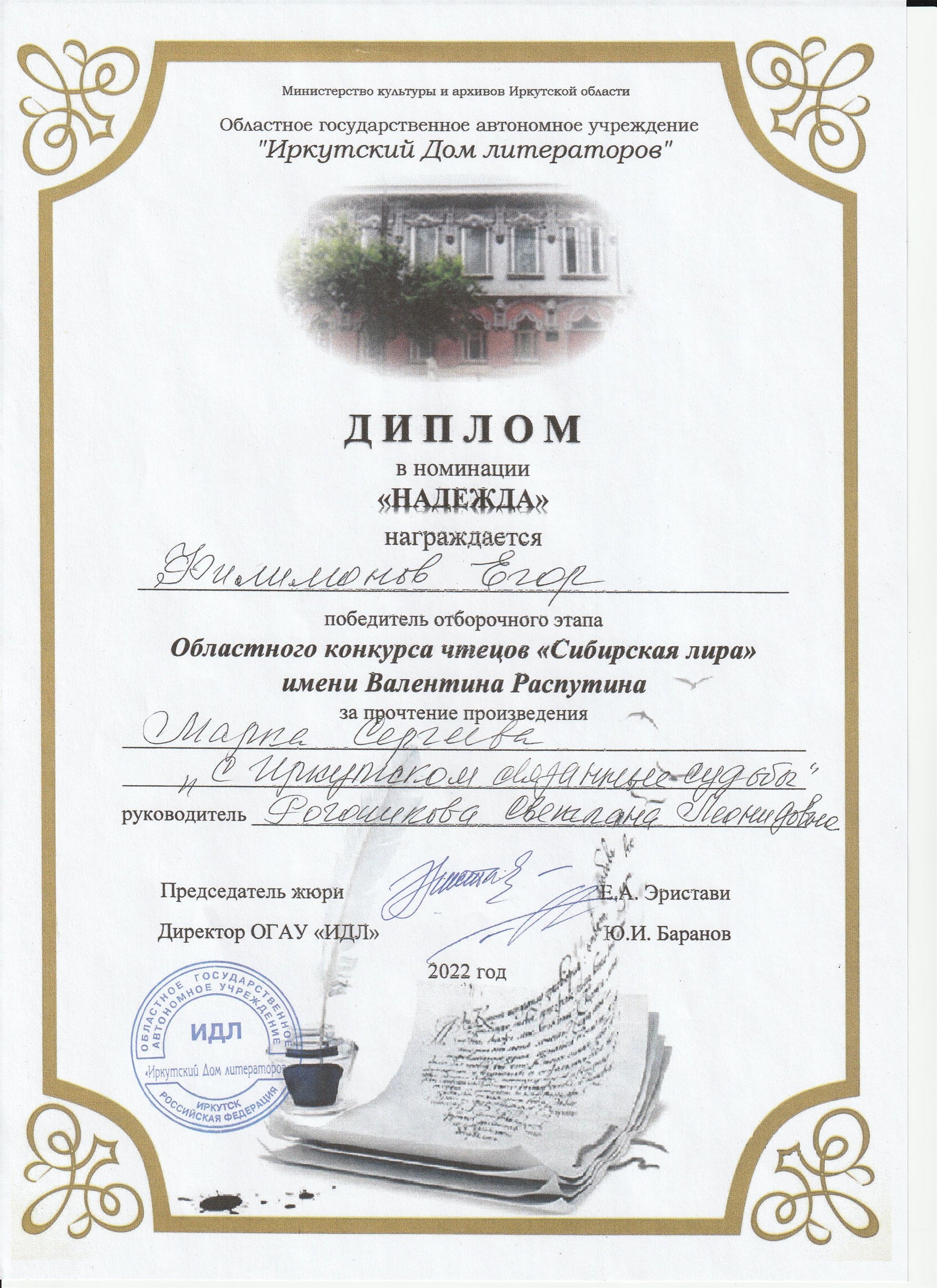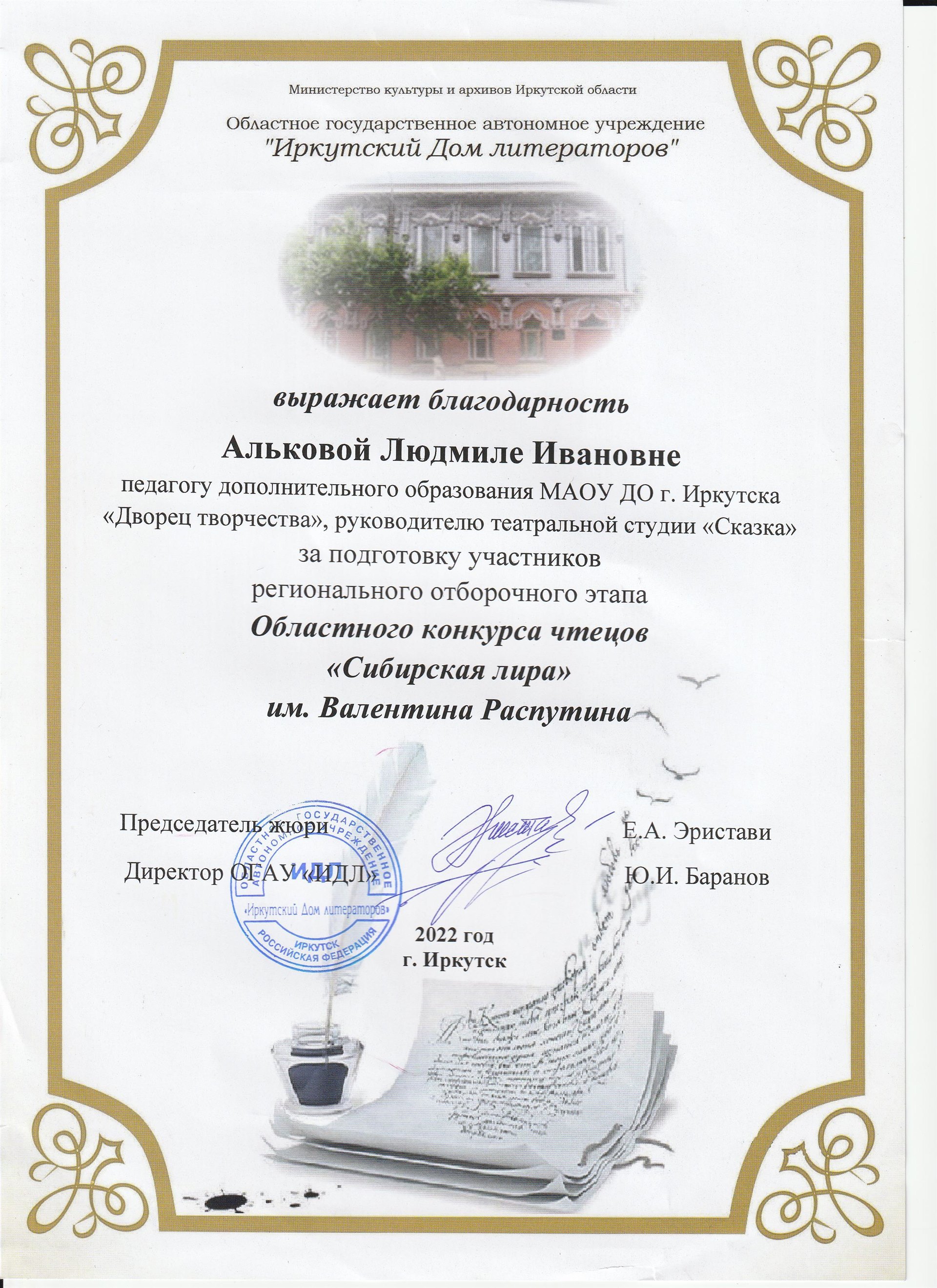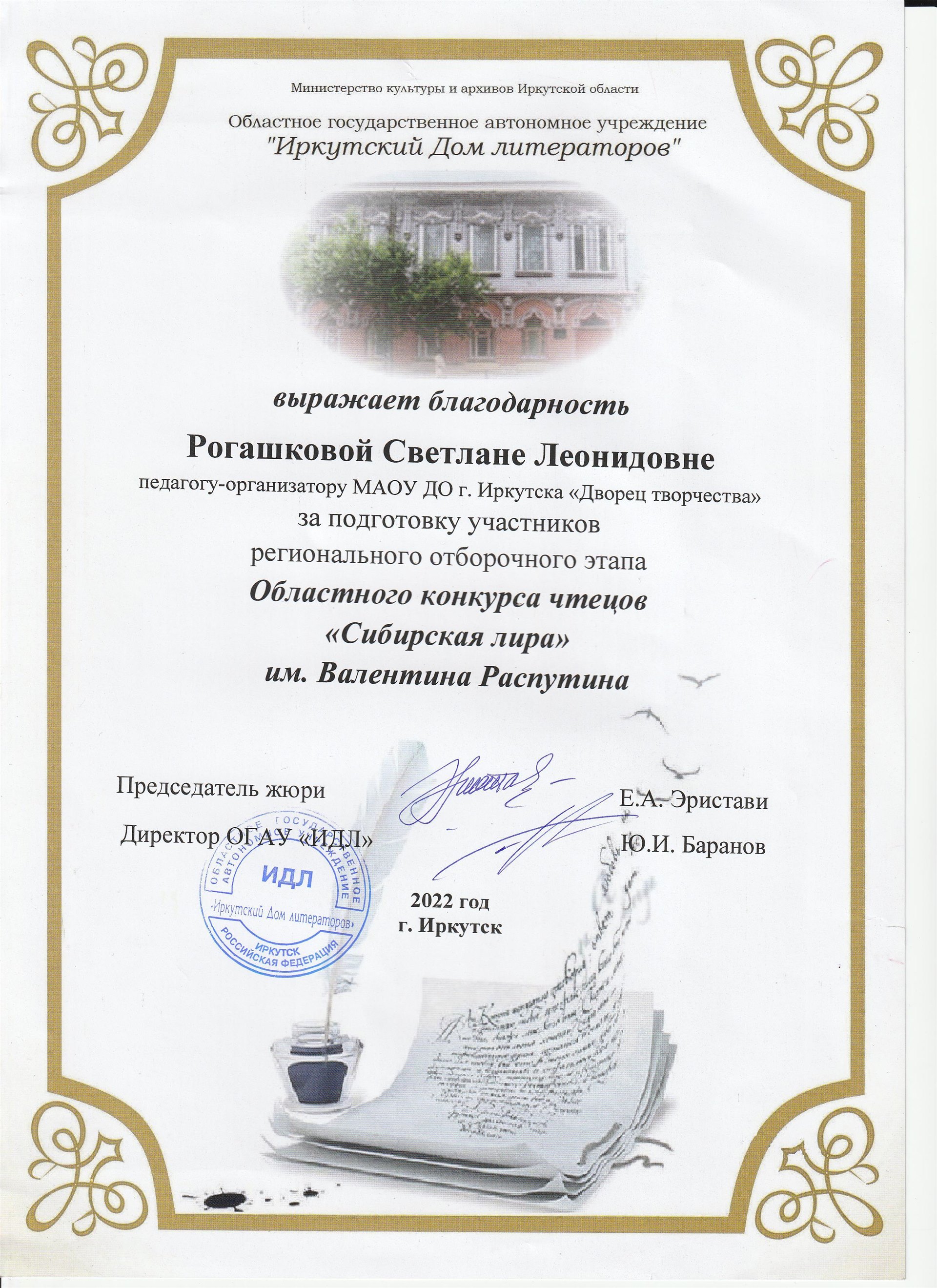 Ежегодный Областной конкурс чтецов «Сибирская лира» собрал на отборочном туре любителей творчество писателей и поэтов Иркутской области, как классических, так и современных, в Иркутске 22 октября 2022 года. Конкурс проводился в двух возрастных категориях: от 5 до 14 лет и 15+. Особой любовью пользовались, как всегда, произведения Валентина Распутина, Владимира Скифа, Александра Вампилова, Марка Сергеева и многих других.