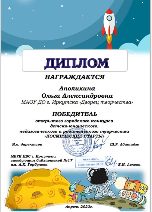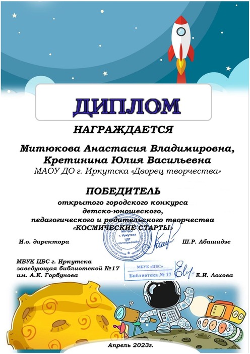 С 1 по 17 апреля 2023 года Центр детского творчества «Октябрьский» совместно с МБУК ЦБС г. Иркутска библиотекой №17 им. А.К. Горбунова организовал и провёл в дистанционном формате Конкурс детско-юношеского педагогического и родительского творчества «Космические старты», посвященный 62-летию полета в космос Ю.А. Гагарина.
