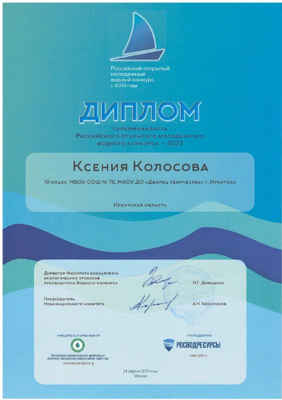 Учащиеся объединения «Водная экология Байкальского региона» МАОУ ДО г. Иркутска «Дворец творчества», Зеленков Егор (ученик 10 класса МАОУ Лицея ИГУ г. Иркутска) и Колосова Ксения (ученица 10 класса МБОУ СОШ № 75 г. Иркутска) вышли в суперфинал и получили возможность представлять Иркутскую область с проектом «Исследование экологического состояния и определение качества воды реки Большая Кузьмиха» (Руководители Зеленкова Наталья Александровна – ПДО Дворца творчества и Кудрявцева Юлия Николаева – учитель географии СОШ №75).