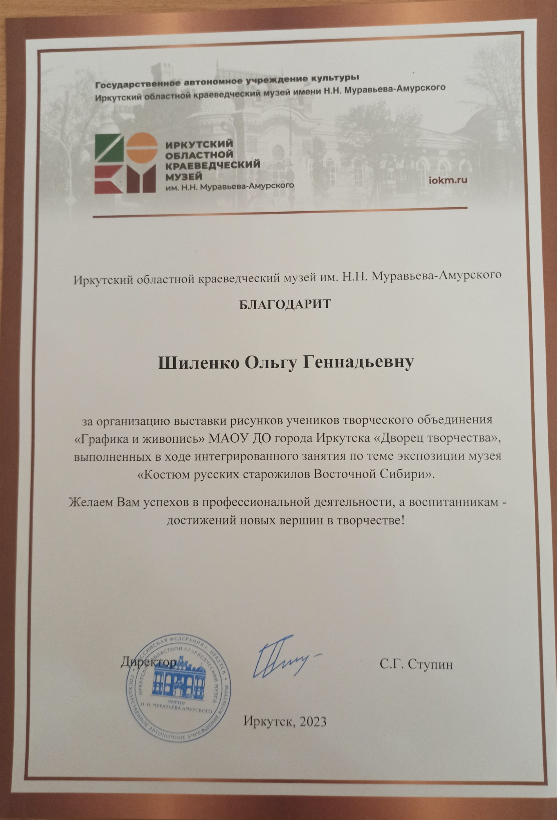 8 ноября состоялось награждение учащихся объединения «Графика и живопись» за участие в выставке рисунков «Костюм русских старожилов Восточной Сибири». Именные грамоты и подарки получили 20 ребят, а так же отмечена благодарственным письмом их руководитель – Шиленко Ольга Геннадьевна. Творческие работы объединения можно увидеть на тематической экспозиции в Иркутском Областном Краеведческом музее им. Н.Н. Муравьева-Амурского по адресу: г. Иркутск, ул. Карла Маркса, 13.
