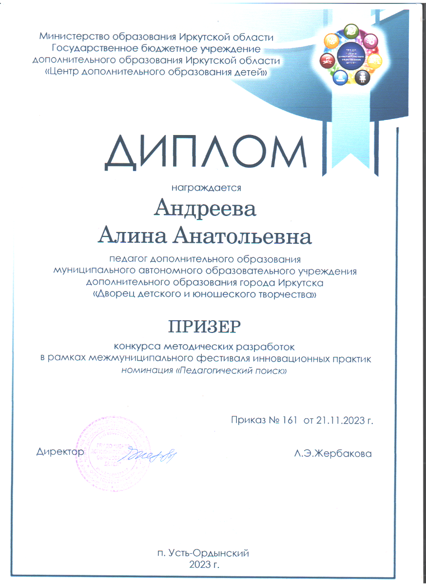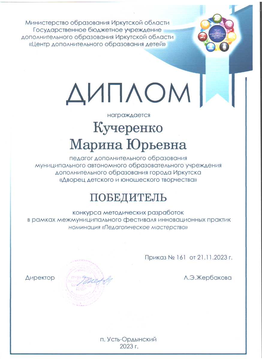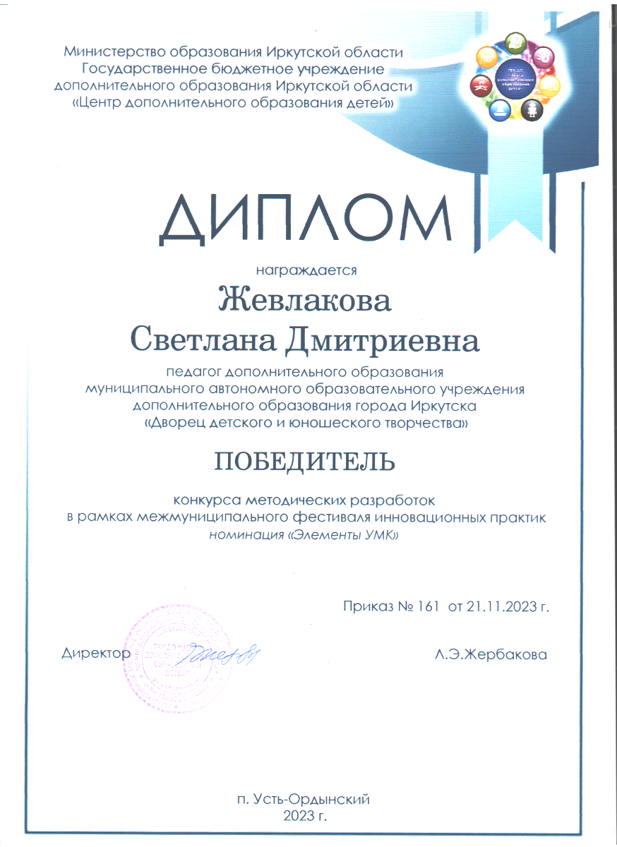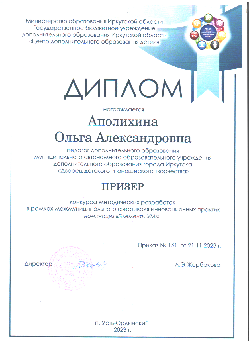 Медяник Г. А. отметила, что «обществу сегодня нужен специалист, не только имеющий функциональную готовность к профессиональной деятельности, но и сформированный как творческая личность». Одним из характерных признаков методического творчества является способность разрабатывать практические методики (инструментарий). Внешняя оценка методического творчества Кучеренко Марины Юрьевны, Жевлаковой Светланы Дмитриевны, Аполихиной Ольги Александровны, Андреевой Алины Анатольевны показала, что данное качество у педагогов достаточно высоко развито. 21 ноября 2023 года в п. Усть-Ордынский в рамках семинара «УМК как средство повышения качества дополнительного образования» были подведены итоги фестиваля инновационных практик – конкурса методических идей и разработок, который проходил с 26 сентября по 17 ноября 2023. Всего приняли участие в конкурсе 21 педагог. Наши педагоги дополнительного образования выступили достойно: