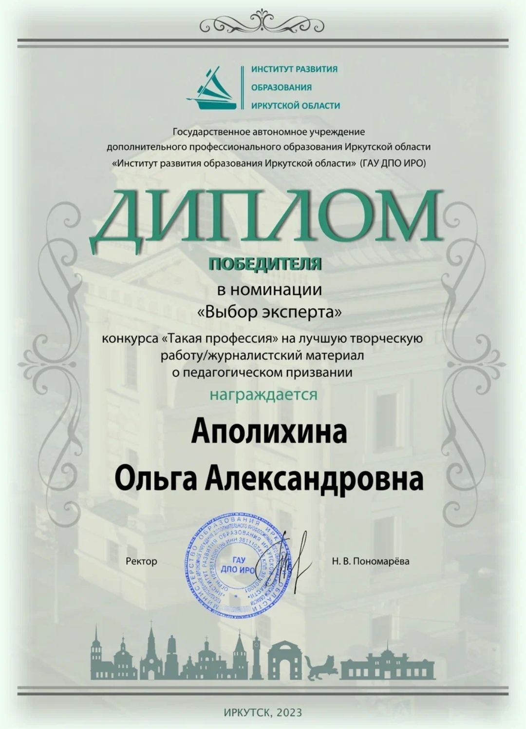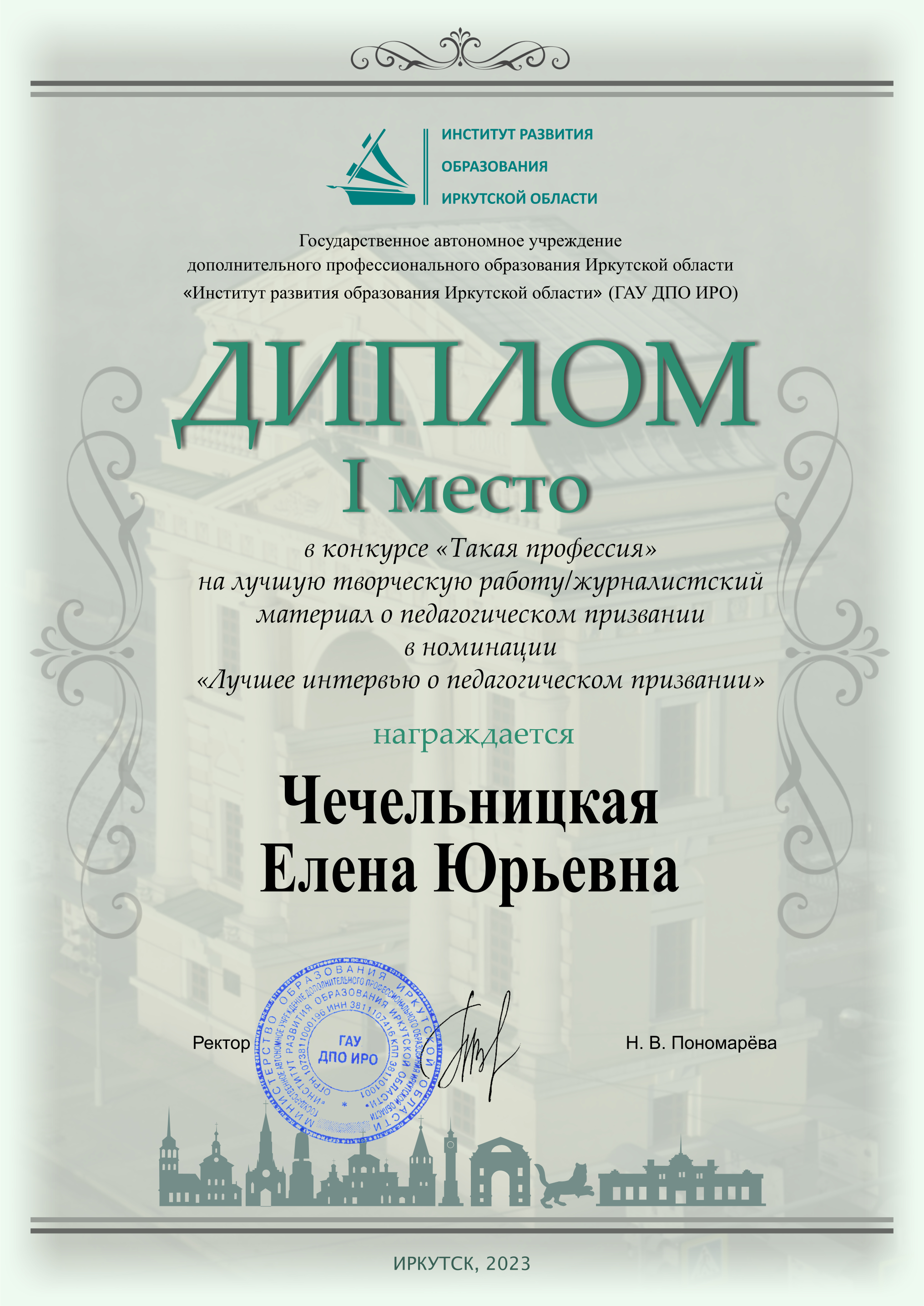 В Год педагога и наставника издательско-просветительский центр Института развития образования Иркутской области провел конкурс на лучшую творческую работу/журналистский материал о педагогическом призвании «Такая профессия» по номинациям «Лучшее эссе о педагогическом призвании», «Лучшее интервью о педагогическом призвании», «Лучший очерк о человеке, выбравшем педагогическое призвание». В конкурсе приняли участие 126 педагогов образовательных организаций региона. Не остался в стороне и Дворец творчества. Свои творческие работы направили педагоги дополнительного образования Чечельницкая Елена Юрьевна и Аполихина Ольга Александровна.