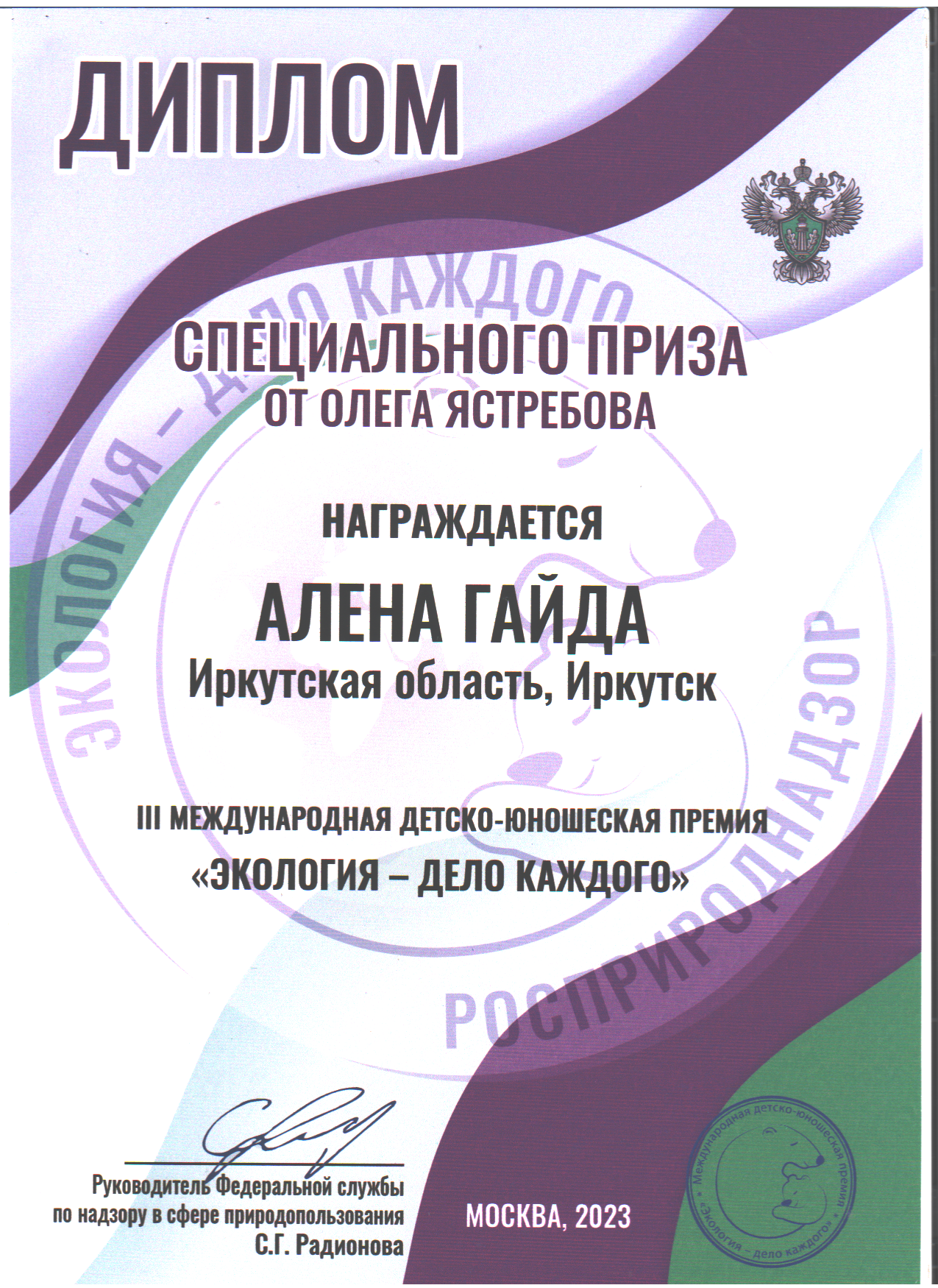 20 декабря 2023 года Губернатор Иркутской области Игорь Кобзев и руководитель Межрегионального управления Росприроднадзора по Иркутской области и Байкальской природной территории Оксана Курек вручили награды победителям и призерам III международной премии «Экология – дело каждого».