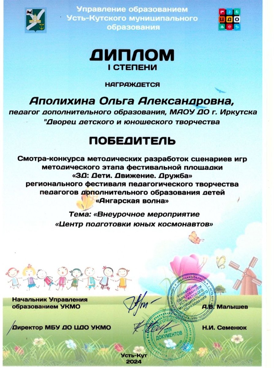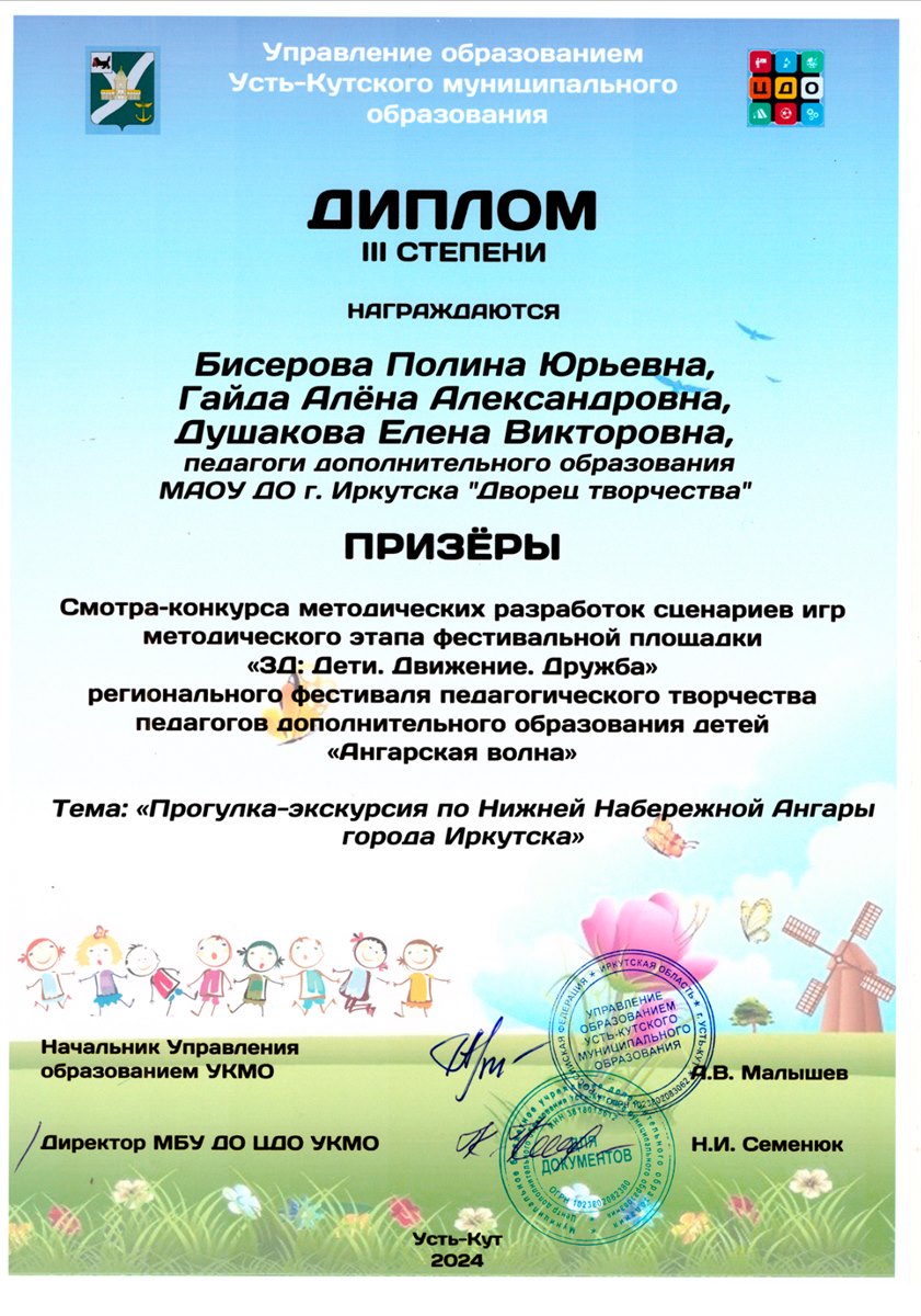 Центр развития дополнительного образования Института развития образования Иркутской области и МБУ ДО ЦДО УКМО в рамках тематической площадки «3-Д: Дети. Движение. Дружба» регионального фестиваля педагогического творчества «Ангарская волна» провели смотр-конкурс методических разработок сценариев Игр с 13.03 по 26.04.2024. Итоги подведены 27.04.2024 (приказ № 152-ОД МБУ ДО «Центр дополнительного образования Усть-Кутского муниципального образования»).