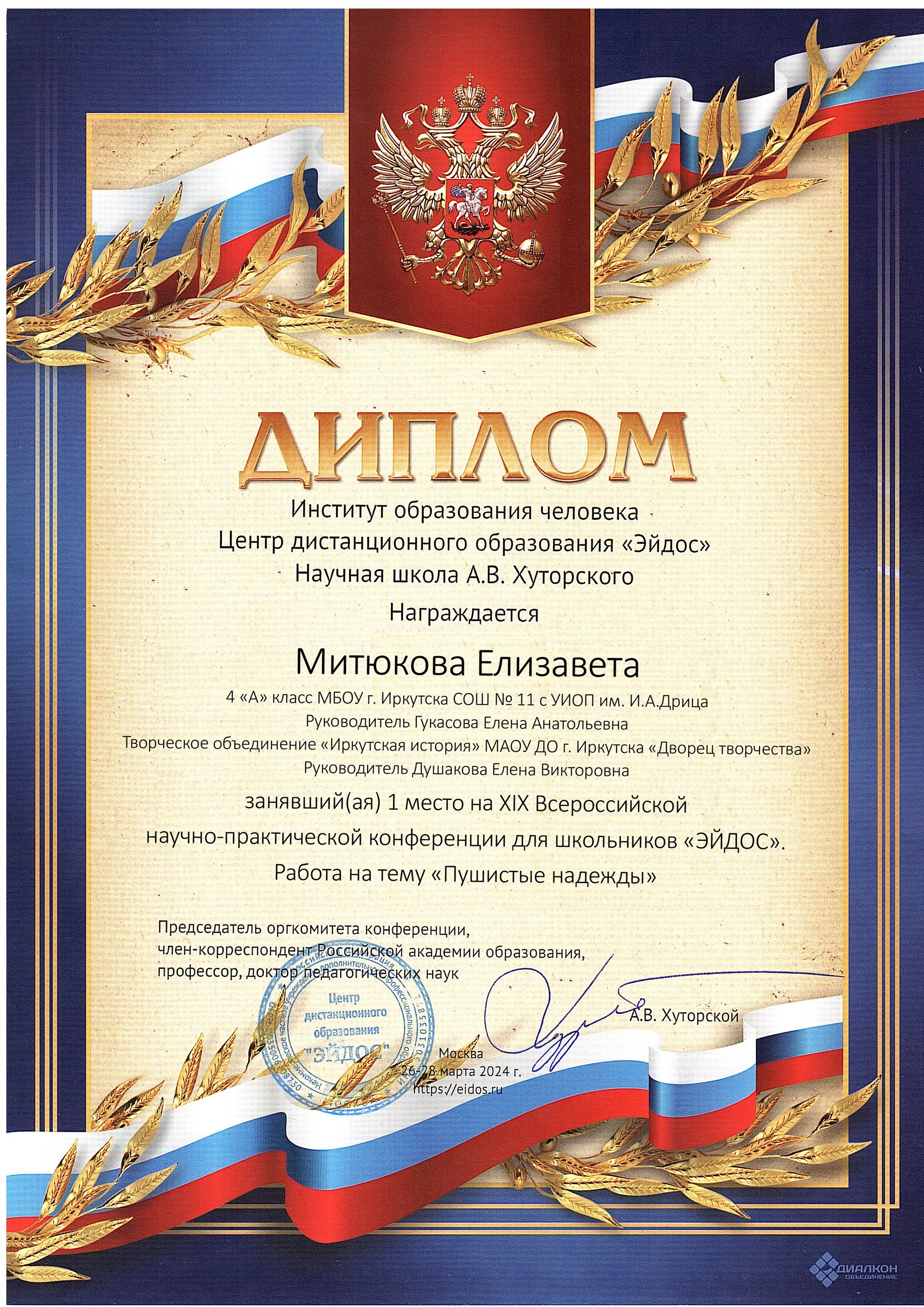Краеведы творческого объединения «Иркутская история» МАОУ ДО г. Иркутска «Дворец творчества» (руководитель – Душакова Е.В.) приняли участие во Всероссийской XIX конференции для школьников «Эйдос», которая проходила 26-28 марта 2024 года в г. Москве.