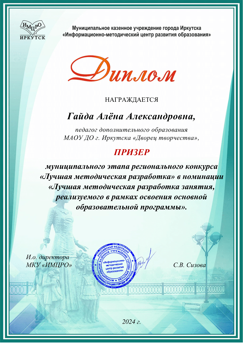 Поздравляем Гайда Алену Александровну, педагога дополнительного образования, ставшую призером муниципального этапа регионального конкурса «Лучшая методическая разработка» в номинации «Лучшая методическая разработка занятия, реализуемого в рамках освоения основной образовательной программы». Желаем новых творческих успехов, ярких свершений и неисчерпаемого энтузиазма!