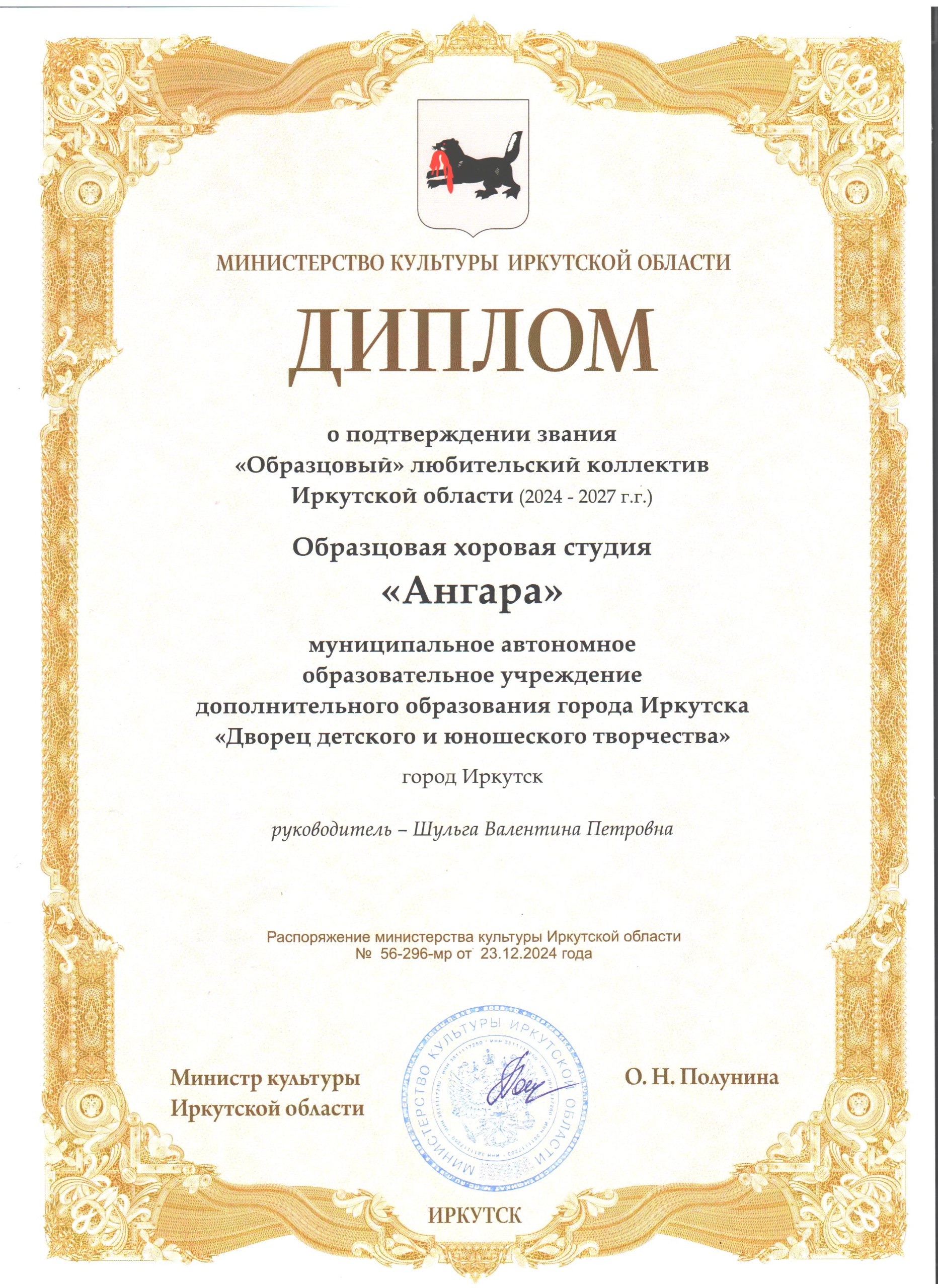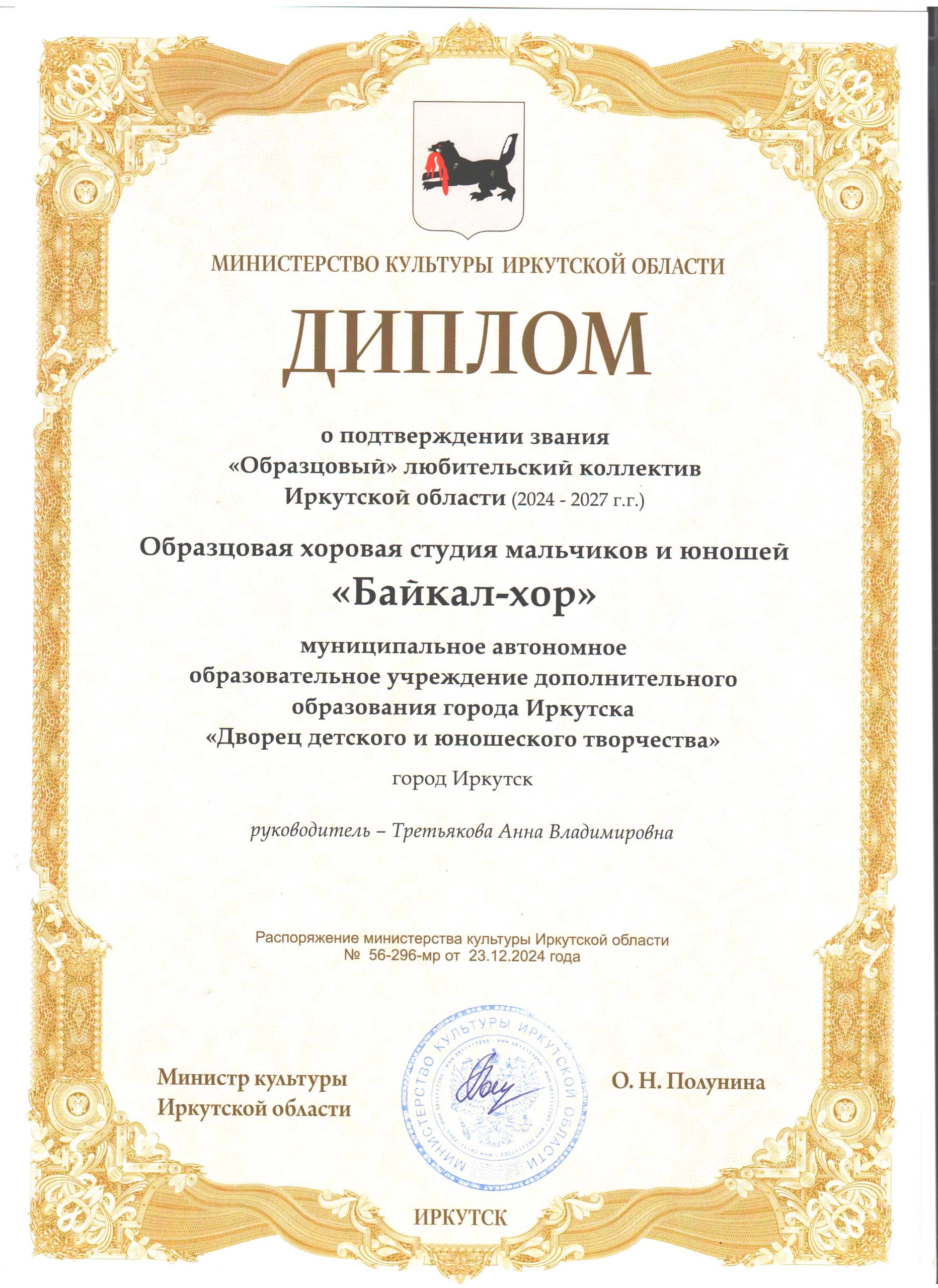 Министерством культуры Иркутской области подписано Распоряжение о подтверждении и присвоении звания "Образцовый" коллективам Иркутской области.
