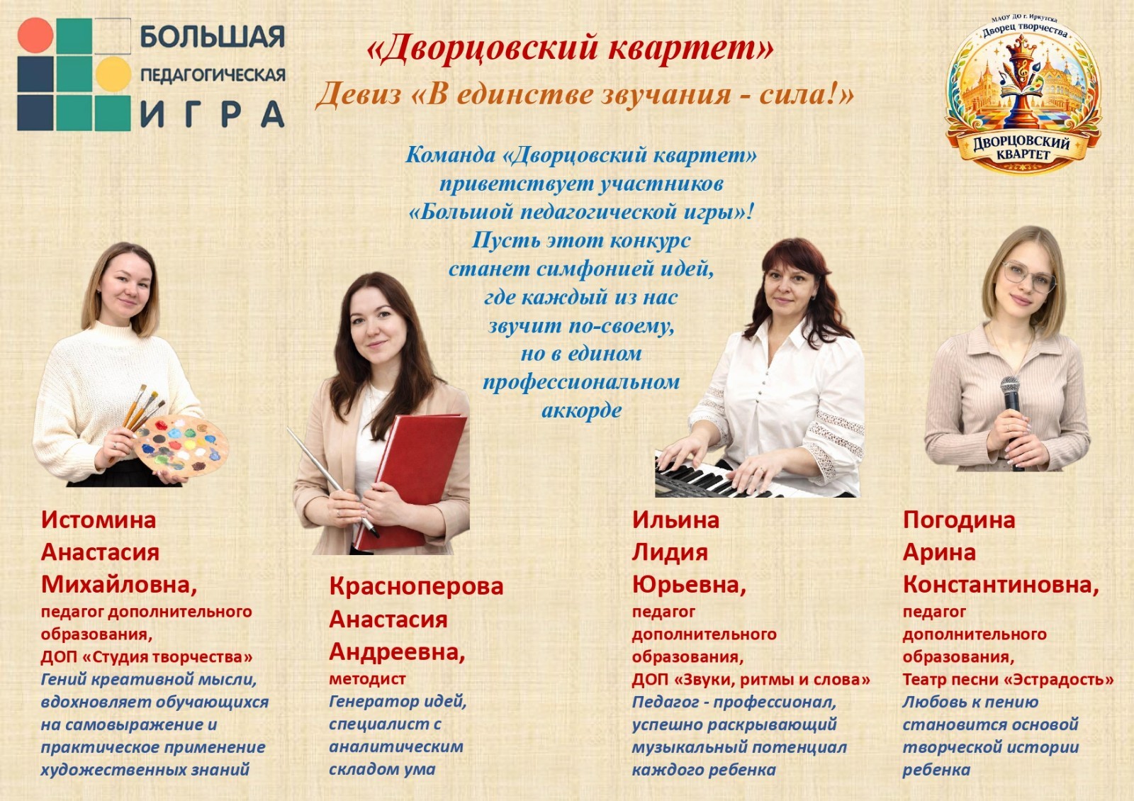 С 24 февраля по 13 марта 2026 года наши педагоги дополнительного образования Истомина Анастасия Михайловна, Ильина Лидия Юрьевна, Погодина Арина Константиновна под руководством методиста Красноперовой Анастасии Андреевны приняли участие в региональном профессиональном конкурсе педагогов и методистов системы дополнительного образования детей «Большая педагогическая игра».