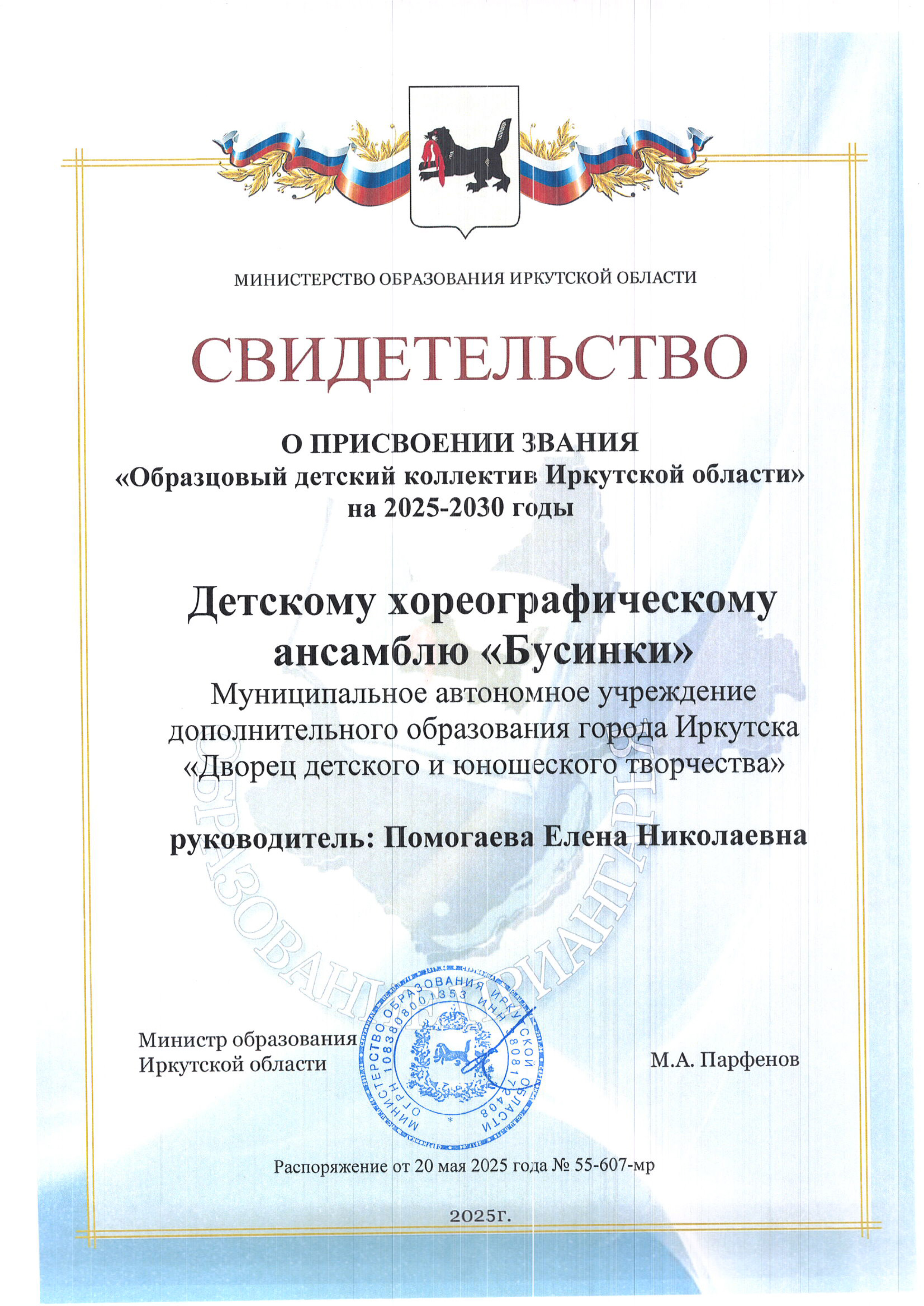 Образцовый детский хореографический ансамбль «Бусинки» – лауреат и дипломант международных, всероссийских, региональных и городских конкурсов и фестивалей в городах: Иркутск, Красноярск, Новосибирск, Москва, Санкт-Петербург, Сочи, Великий Устюг, Париж, Пекин, Улан-Батор, Албена.