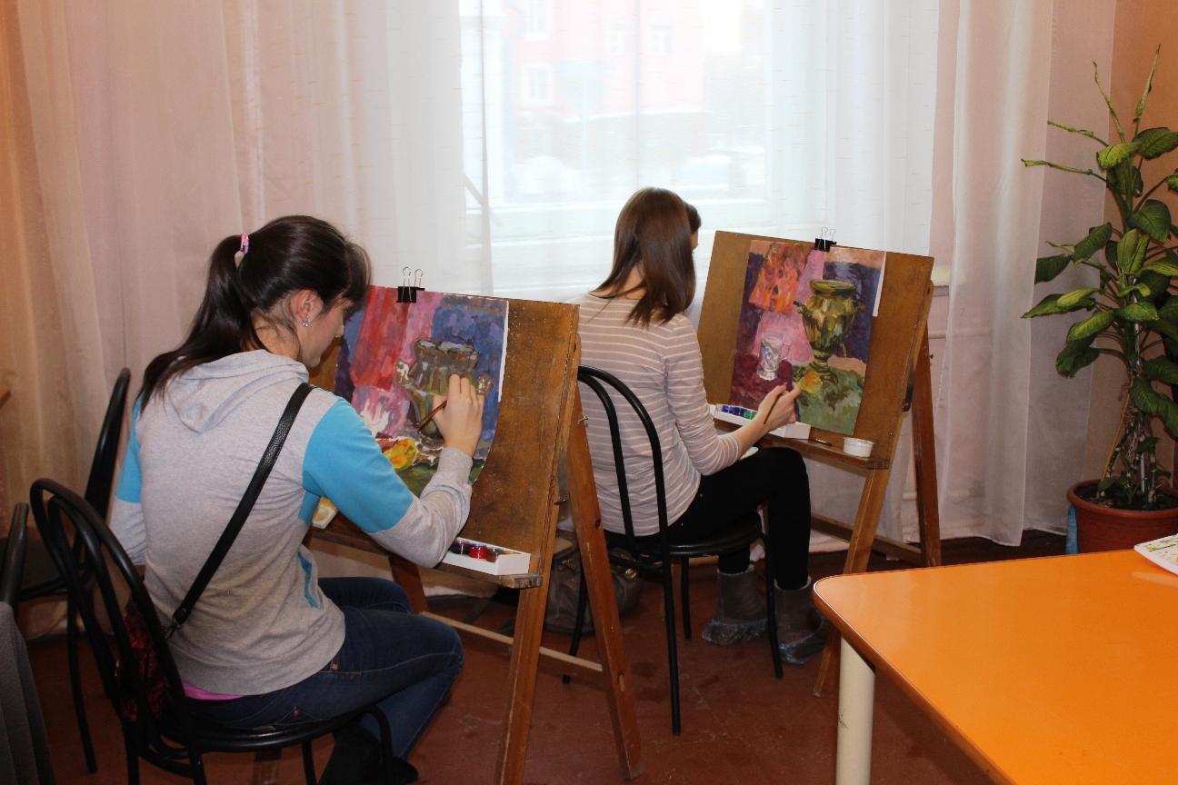 Изучают основы живописи, техника акварели, гуаши и т.д. Акварельные техники и приемы изучаются на протяжении всего курса. Выполняются различные этюды, натюрморты, пейзажи, портреты.