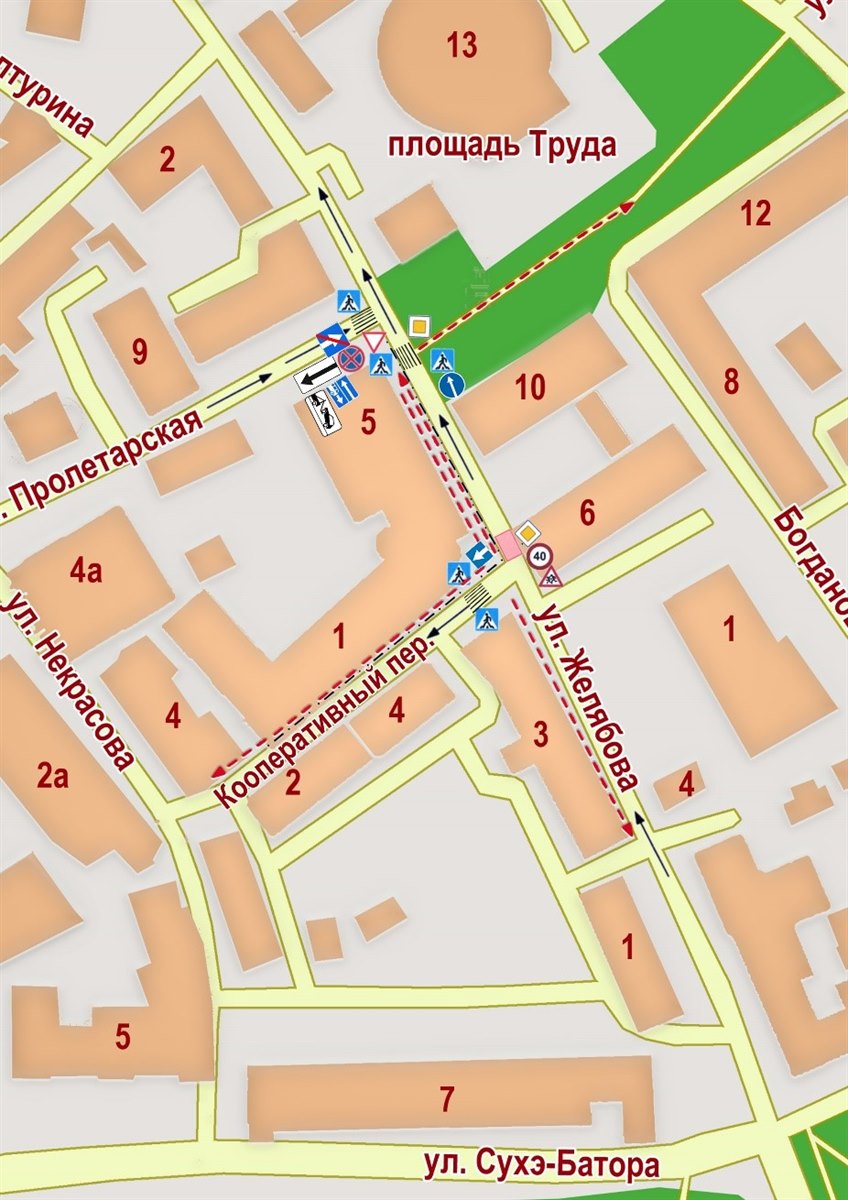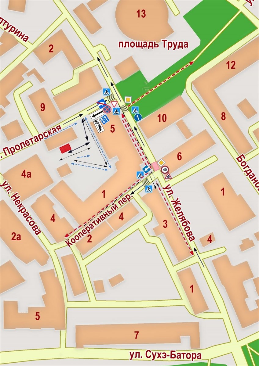 План-схема организации дорожного движения в непосредственной близости от МАОУ ДО г. Иркутска "Дворец творчества" с размещением соответствующих транспортных средств, маршруты движения учащихся и расположения парковочных мест