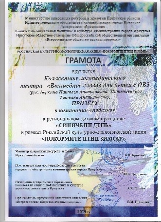 Например, в выставке детского творчества «Новогодний вернисаж» среди учащихся МОО Правобережного округа г. Иркутска (в номинации для детей с ОВЗ) в 2018 году дети получили грамоты за поделки «Умка ищет ёлку» и «Символ года – поросёнок».