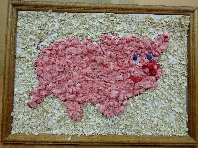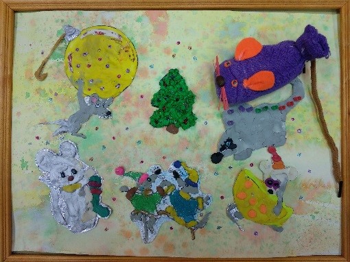 А в 2019 году панно «Встали мыши в хоровод – наступает Новый год» было отмечено специальным призом оценочной комиссии. В панно были собраны фрагменты работ с нескольких занятий: мягкая игрушка из носка «Мышка», аппликации из пластилина и крупы, цветного песка.