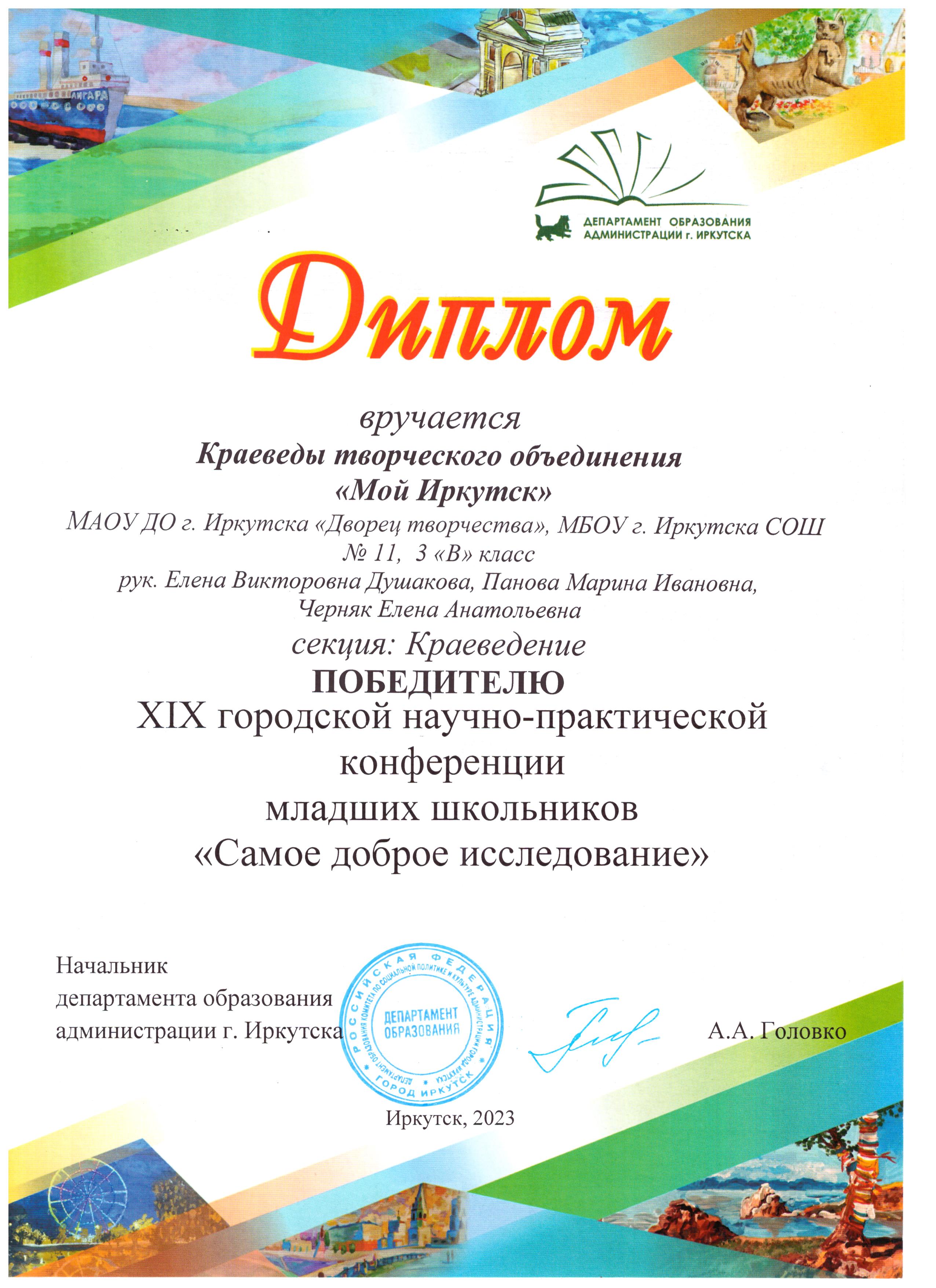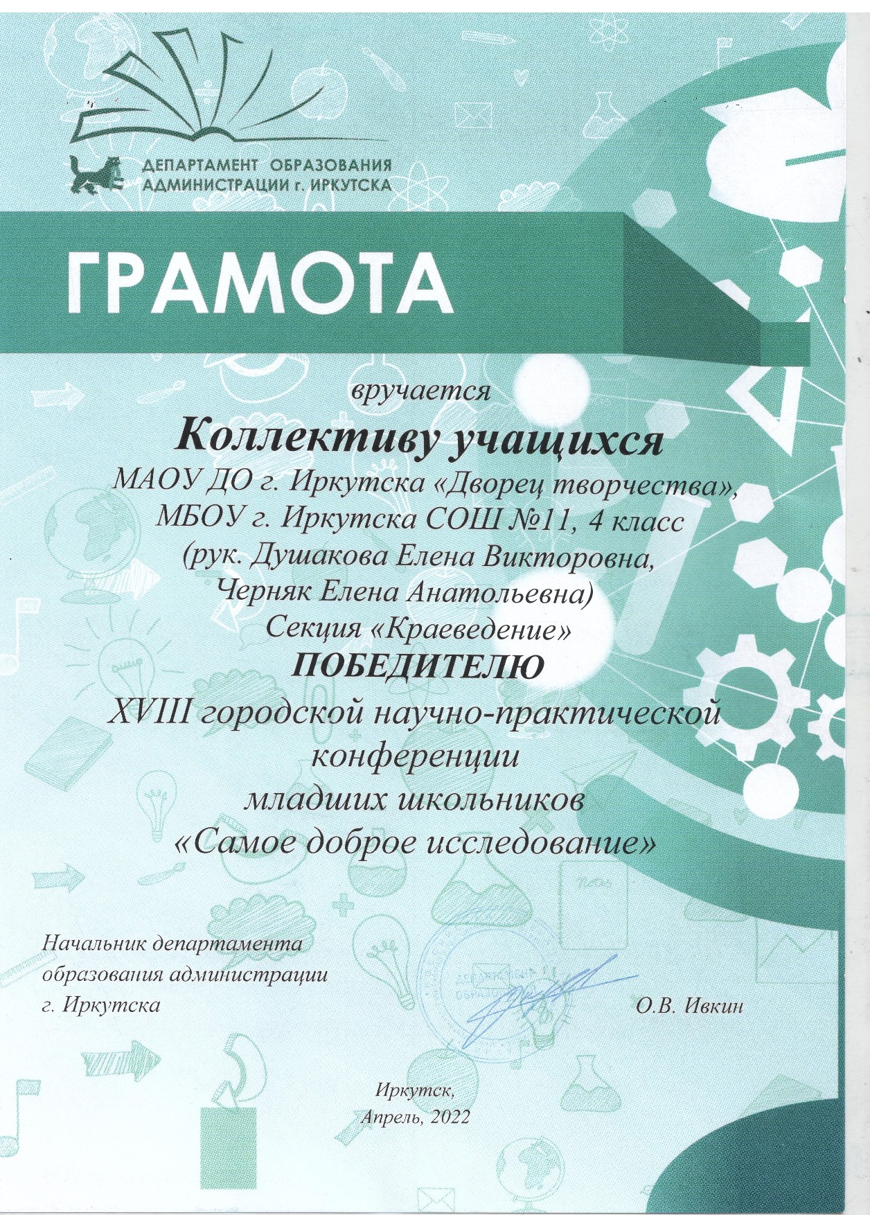 Проект "Улицы родного города: вчера. сегодня, завтра" творческого объединения "Мой Иркутск" в марте 2023 года стал победителем в секции "Краеведение" на XIX городской научно-практической конференции младших школьников «Самое доброе исследование» (ссылка)