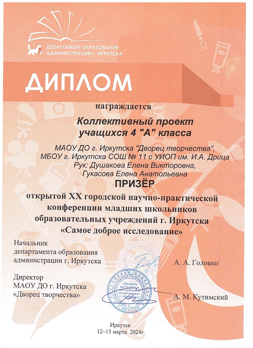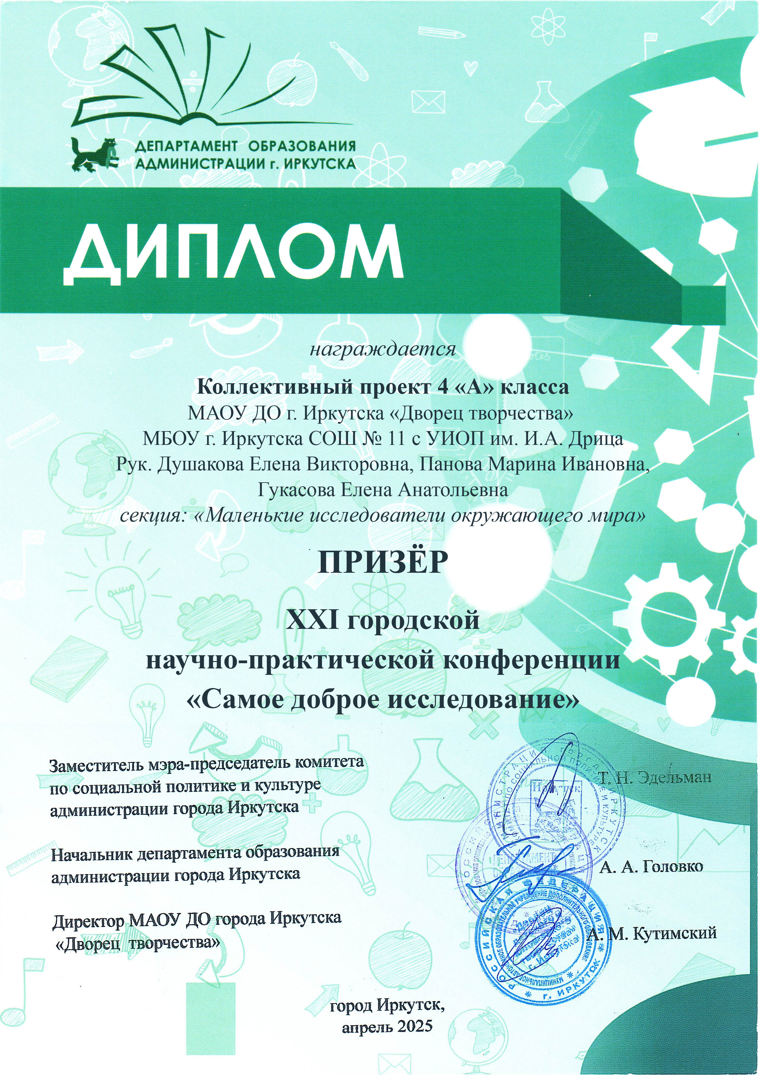 Проект "Их имена наш город помнит" творческого объединения "Иркутская история" в апреле 2025 года стал призером в секции "Маленькие исследователи окружающего мира" на XXI городской научно-практической конференции младших школьников «Самое доброе исследование» (ссылка)