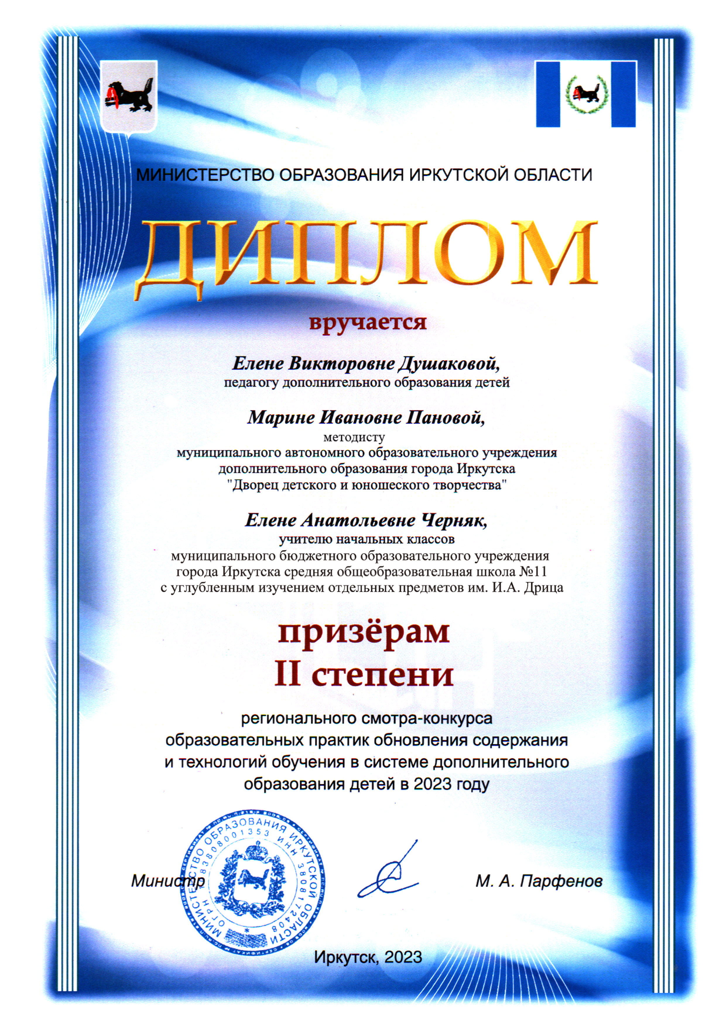 Региональный смотр-конкурс образовательных практик обновления содержания и технологий обучения в системе дополнительного образования детей 2023 – ПРИЗЕРЫ II СТЕПЕНИ (ссылка)