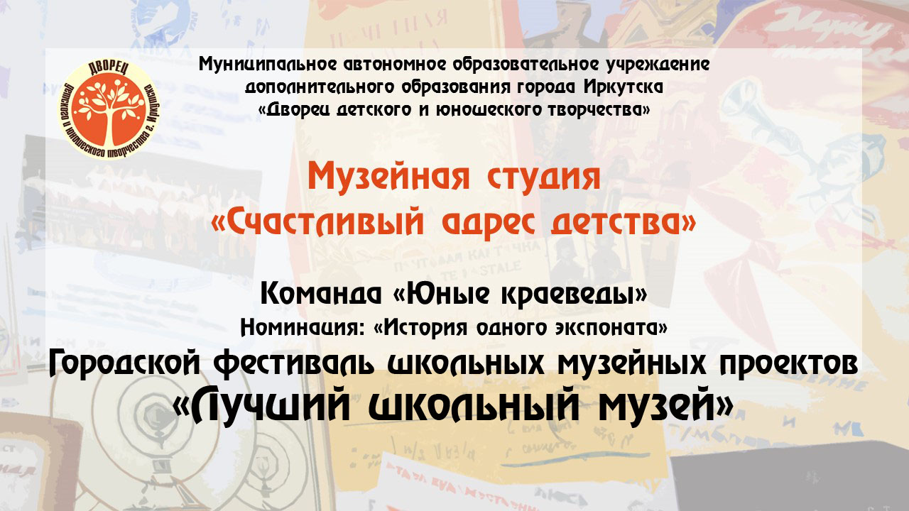 16 февраля 2022 года на онлайн платформе «Иркутская открытая школа» завершил работу городской фестиваль школьных музейных проектов «Лучший школьный музей». Фестиваль проходил в форме историко-образовательного музейного хаккатона, с целью создания условий для популяризации лучших музейных проектов ОО г. Иркутска. Около 30 иркутских образовательных организаций приняло участие в хаккатоне. Музейную студию «Счастливый адрес детства» Дворца творчества представляла команда учащихся творческого объединения «Я – Иркутянин» – Сенькина Евгения, Муратов Богдан, Гертле Екатерина и руководители Душакова Е.В. и Панова М.И. В номинации «История одного экспоната» команда «Юные краеведы» презентовала проект «Загадка бюста Маршала» об одном из экспонатов музейной студии – Бюсте Ворошилова с дарственной надписью: «Команде Дворца Пионеров 1 место в стрелковых соревнованиях школьников города 1939 год». Жюри единогласно признали ПОБЕДУ Дворца творчества в данной номинации, а член жюри – сотрудник Музея-Усадьбы В.П.Сукачева, выразила свое неподдельное восхищение юными дворцовцами. Победа ребят и педагогов – достойный подарок родному Дворцу к его 85-летию!