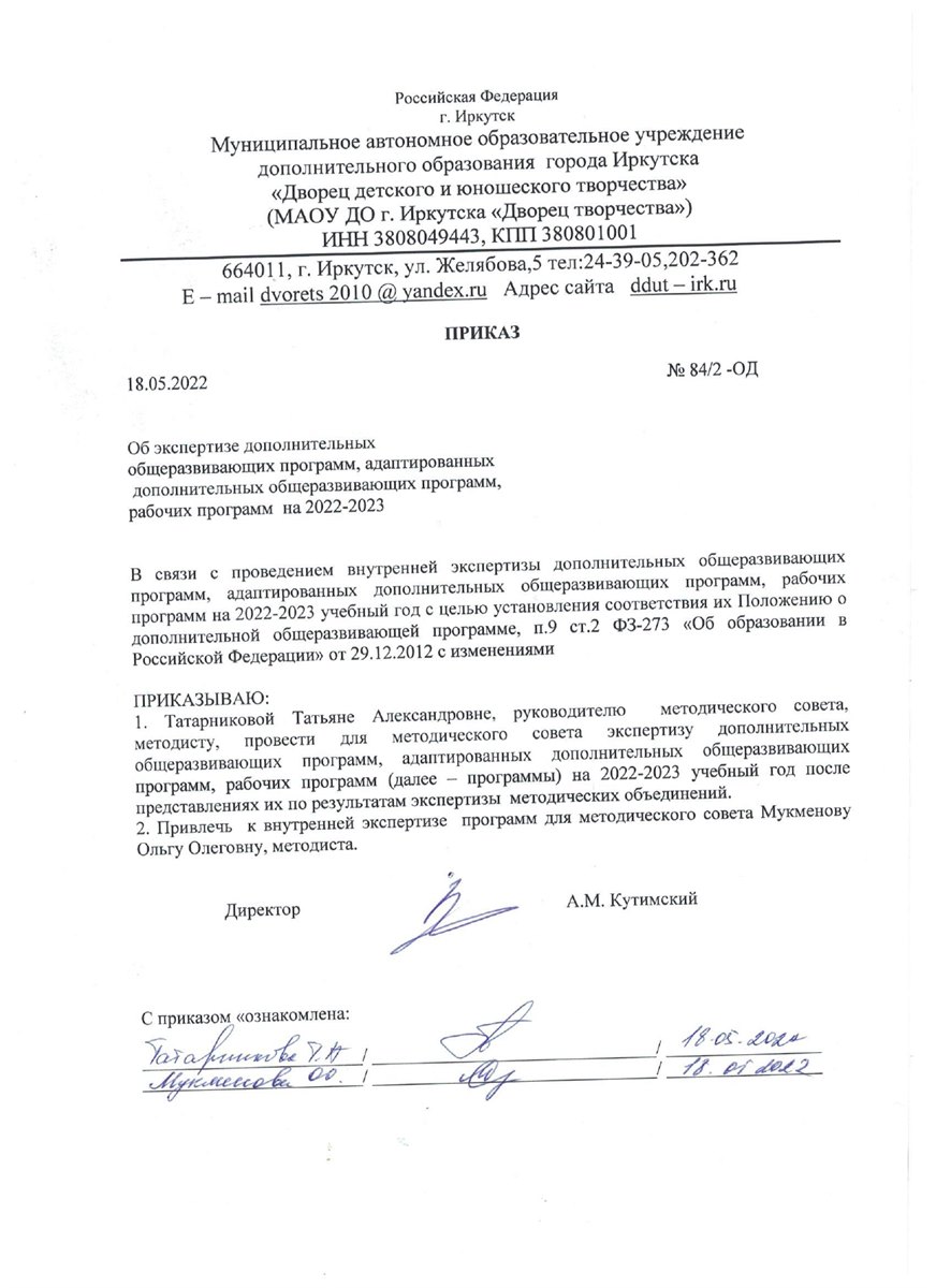 4. Проводить внутреннюю экспертизу дополнительных общеразвивающих программ/адаптированных дополнительных общеразвивающих программ, рабочих программ (далее – программы), локальных актов Учреждения, касающихся организации образовательной деятельности в Учреждении.