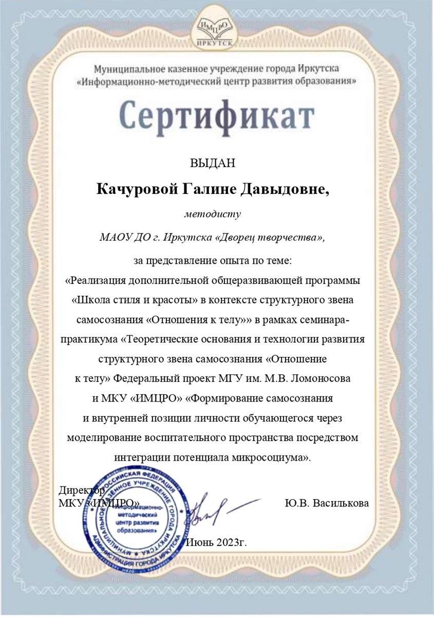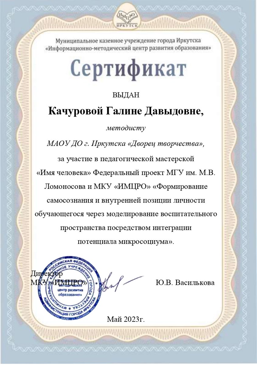 "Проблематика развития самосознания личности ребёнка через моделирование воспитательного пространства Дворца творчества", Качурова Галина Давыдовна, методист МАОУ ДО г. Иркутска "Дворец творчества"