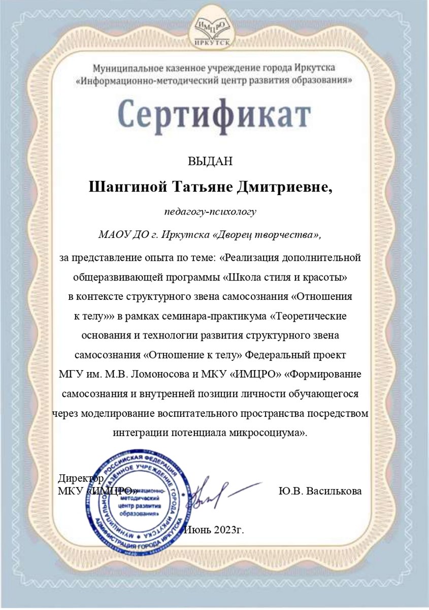 "Особенности развития структурного звена самосознания личности «Отношение к телу» и «Имя» посредством хореографии", Тугаева Дарья Сергеевна, педагог дополнительного образования МАОУ ДО г. Иркутска «Дворец творчества»