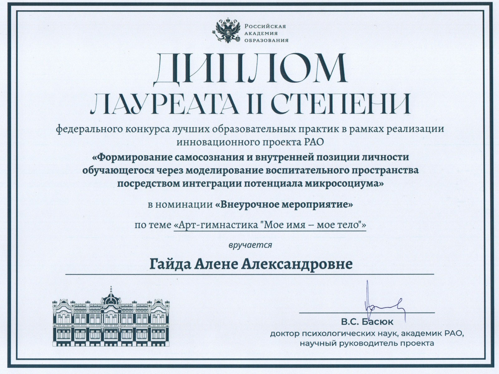 Так же были подведены итоги конкурса лучших образовательных практик в рамках реализации инновационного проекта РАО «Формирование самосознания и внутренней позиции личности обучающегося через моделирование воспитательного пространства посредством интеграции потенциала микросоциума». Среди победителей в номинации «Внеурочное мероприятие» стала наша коллега Гайда Алёна Александровна, с представлением практики «Арт-гимнастика «Моё имя-моё тело», получив Диплом Лауреата II степени.