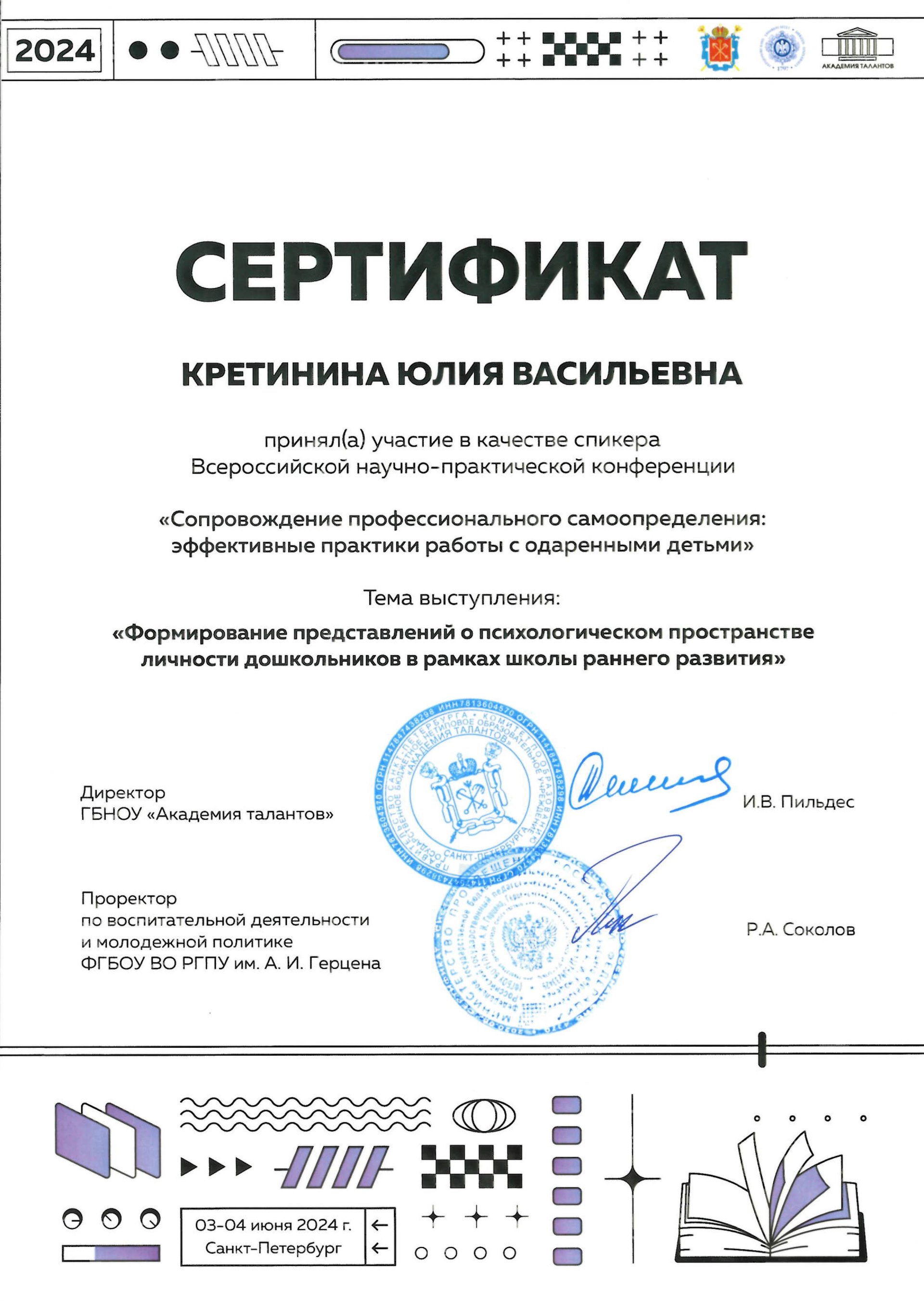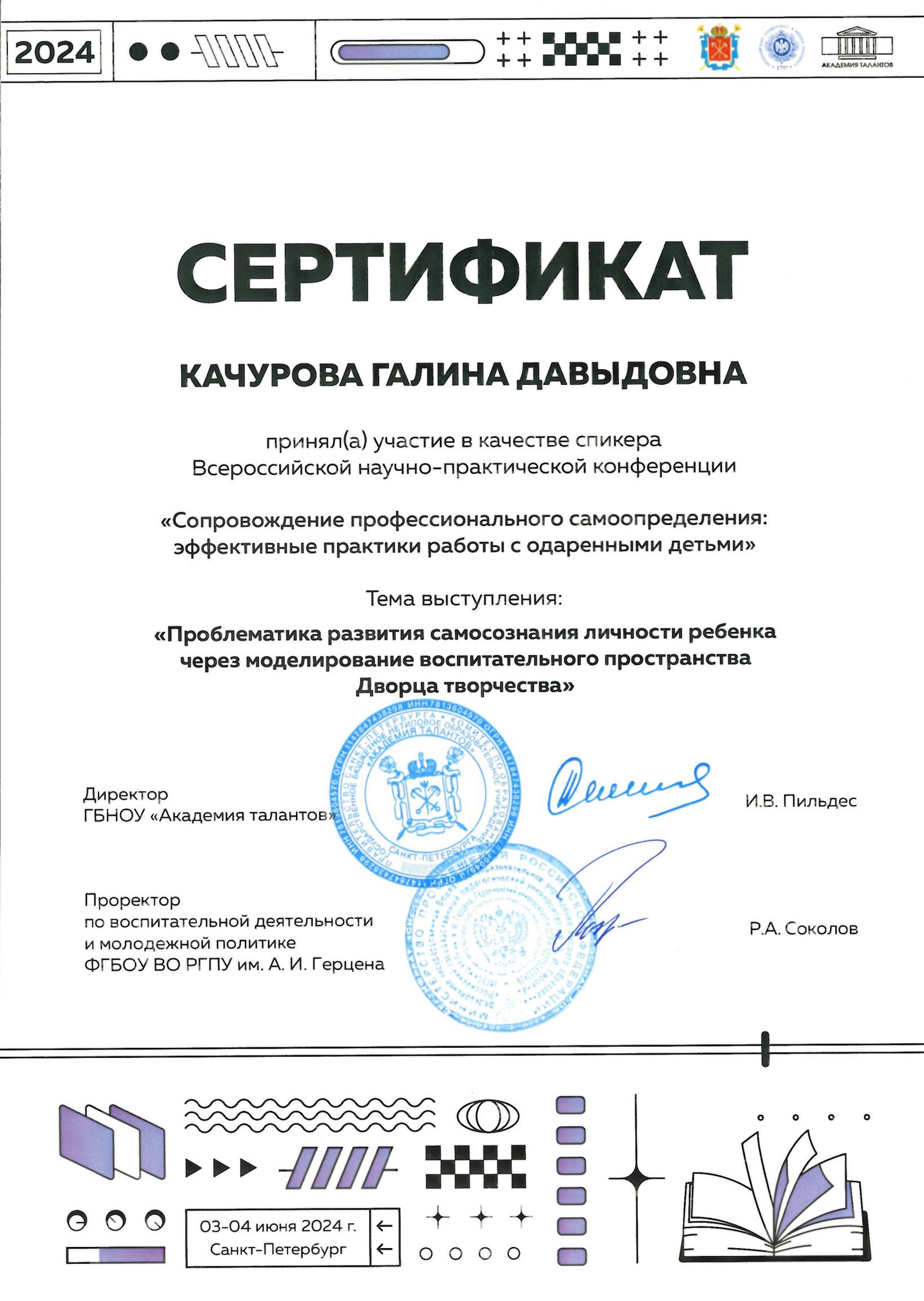 Всероссийская научно-практическая конференция «Сопровождение профессионального самоопределения: эффективные практики работы с одаренными детьми», г. Санкт‑Петербург, 03–04 июня 2024 года