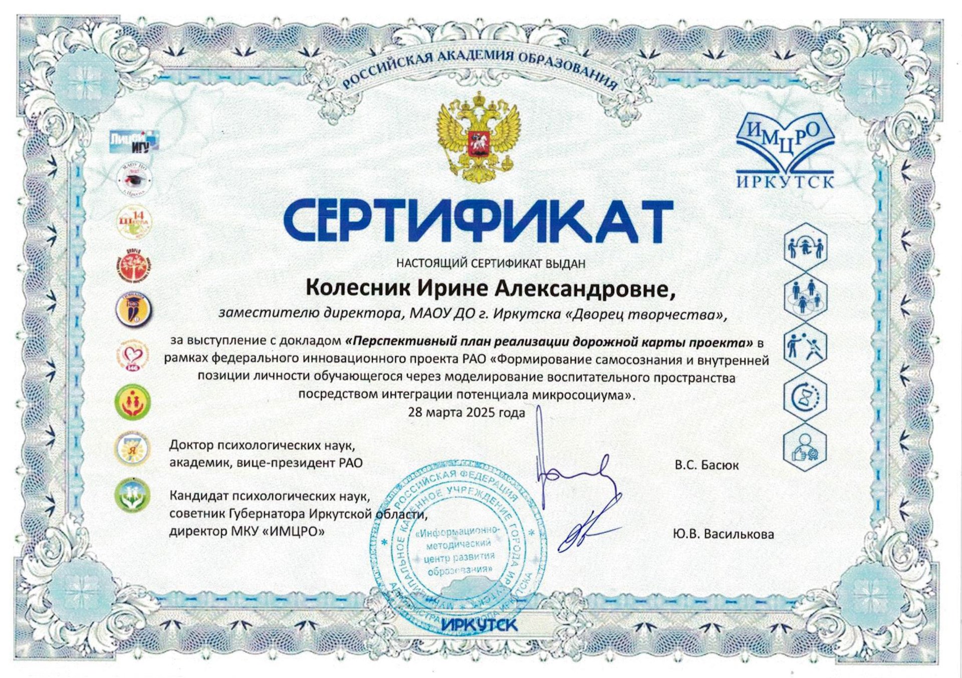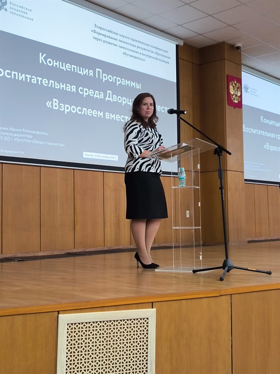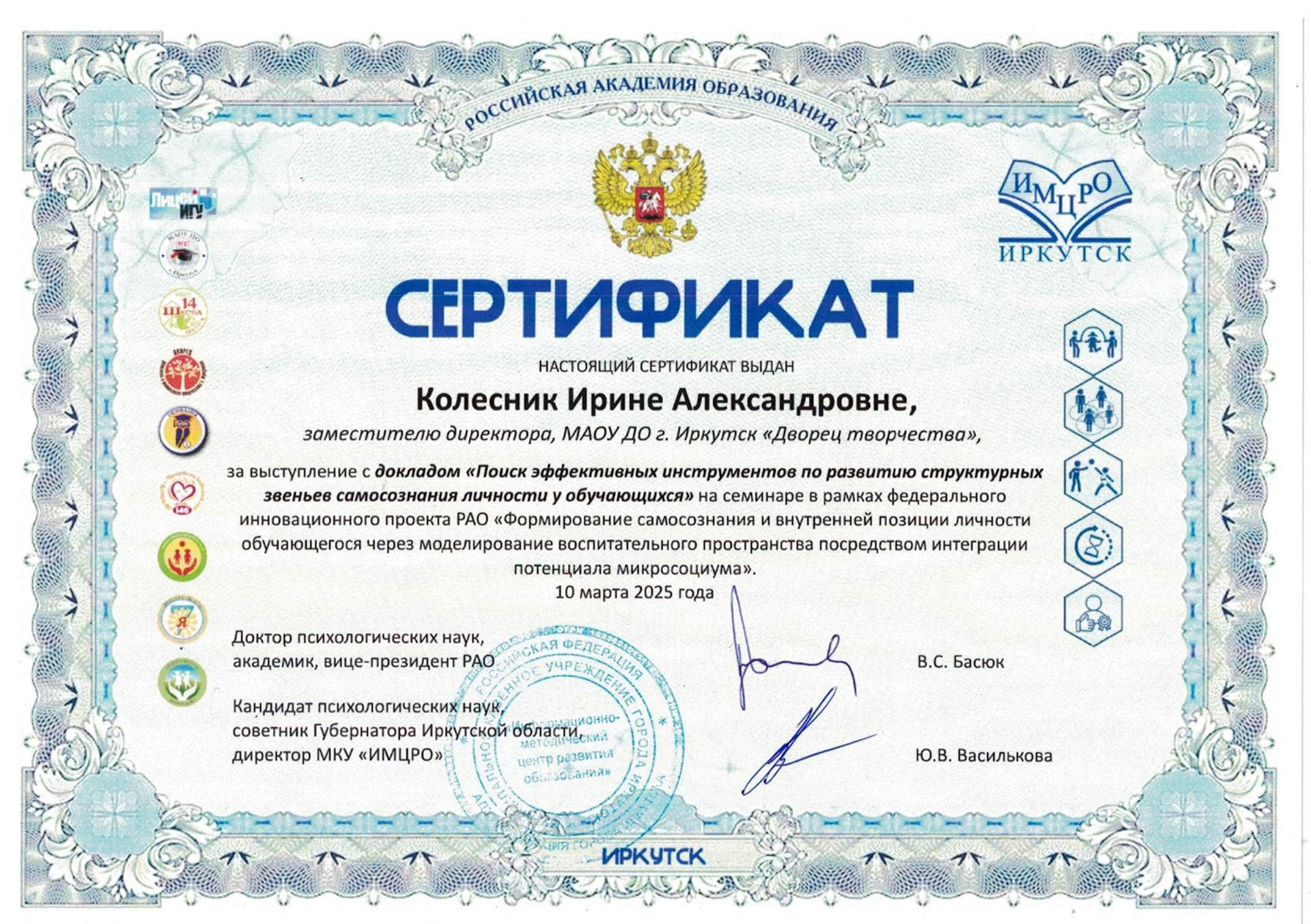 - Колесник Ирина Александровна, заместитель директора МАОУ ДО г. Иркутска «Дворец творчества», доклад на тему «Эффективные инструменты по развитию структурных звеньев самосознания личности обучающихся «Дворца творчества»: анализ полученных данных»;