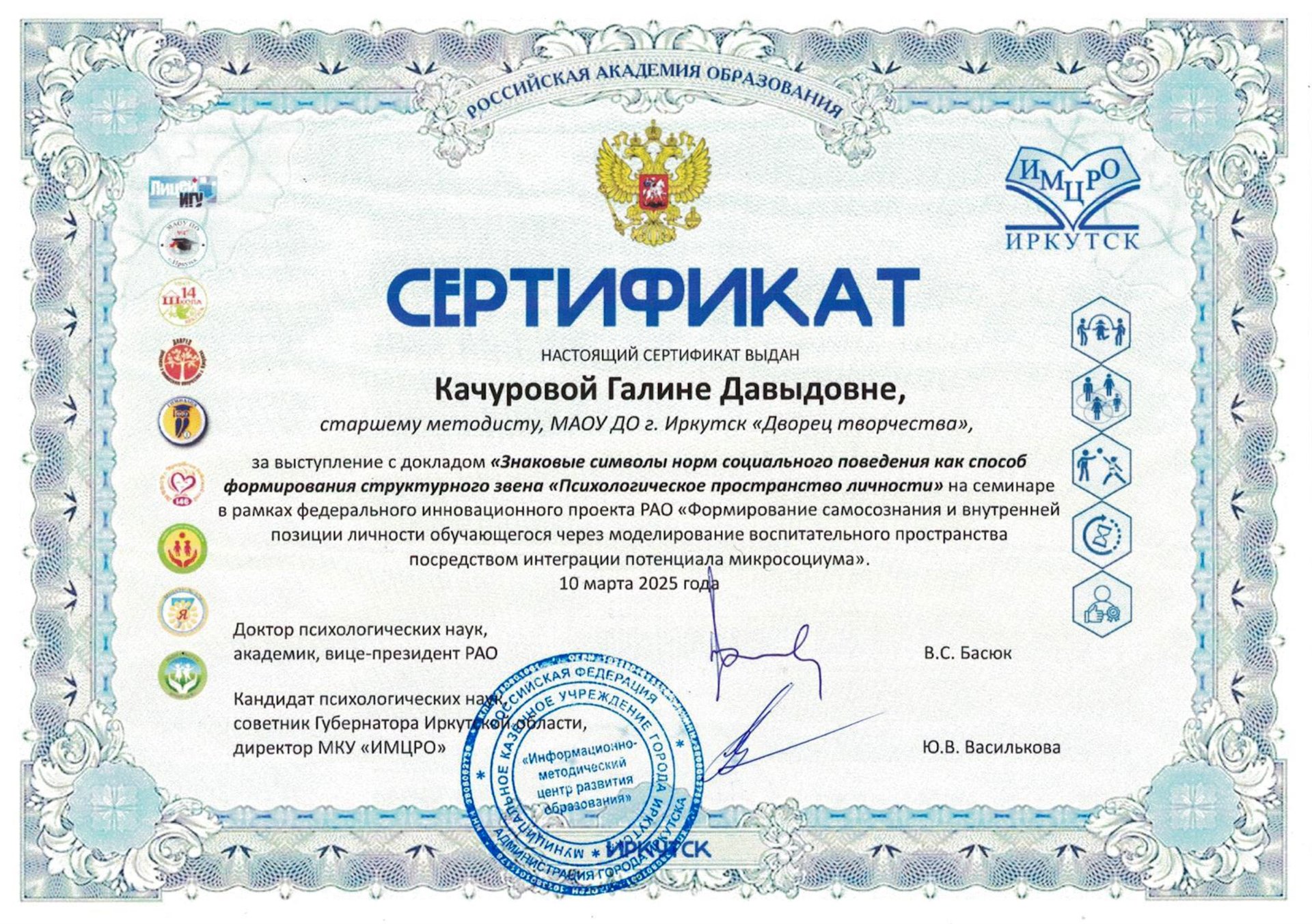 - Качурова Галина Давыдовна, старший методист по теме «Знаковые символы норм социального поведения как способ формирования структурного звена «Психологическое пространство».