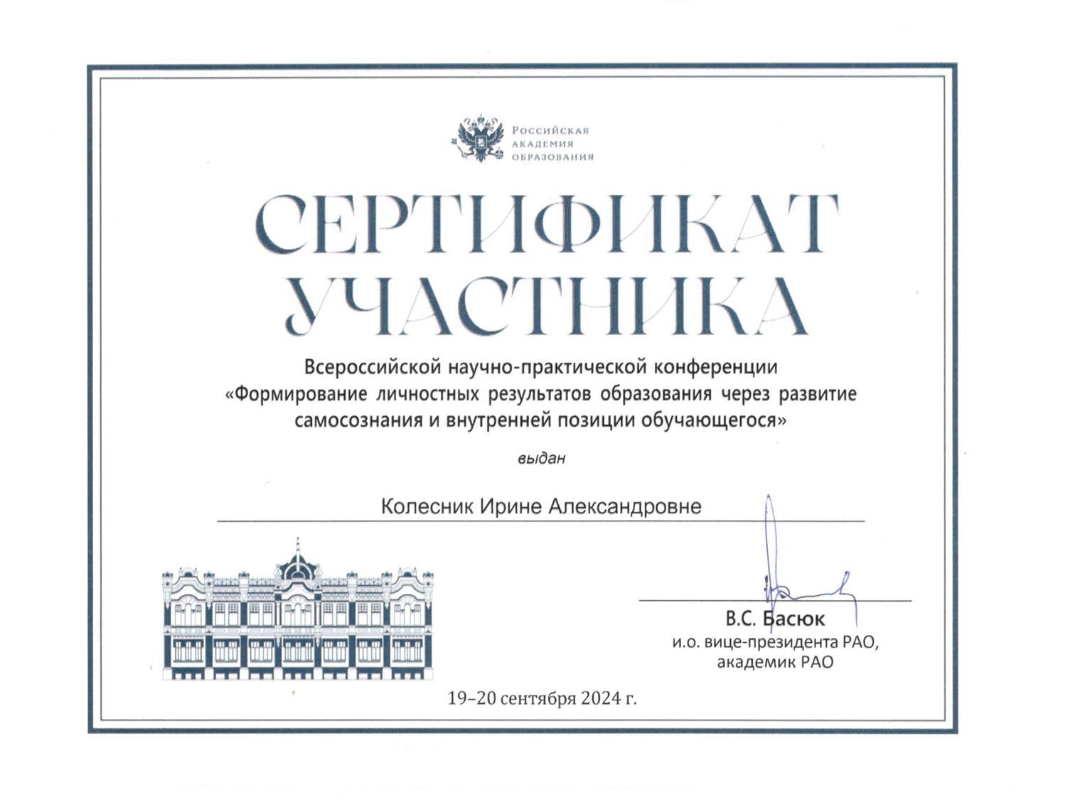 19-20 сентября 2024 года на площадке Российской Академии Образования в г. Москва состоялась Всероссийская научно-практическая конференция «ФОРМИРОВАНИЕ ЛИЧНОСТНЫХ РЕЗУЛЬТАТОВ ОБРАЗОВАНИЯ ЧЕРЕЗ РАЗВИТИЕ САМОСОЗНАНИЯ И ВНУТРЕННЕЙ ПОЗИЦИИ ОБУЧАЮЩЕГОСЯ».