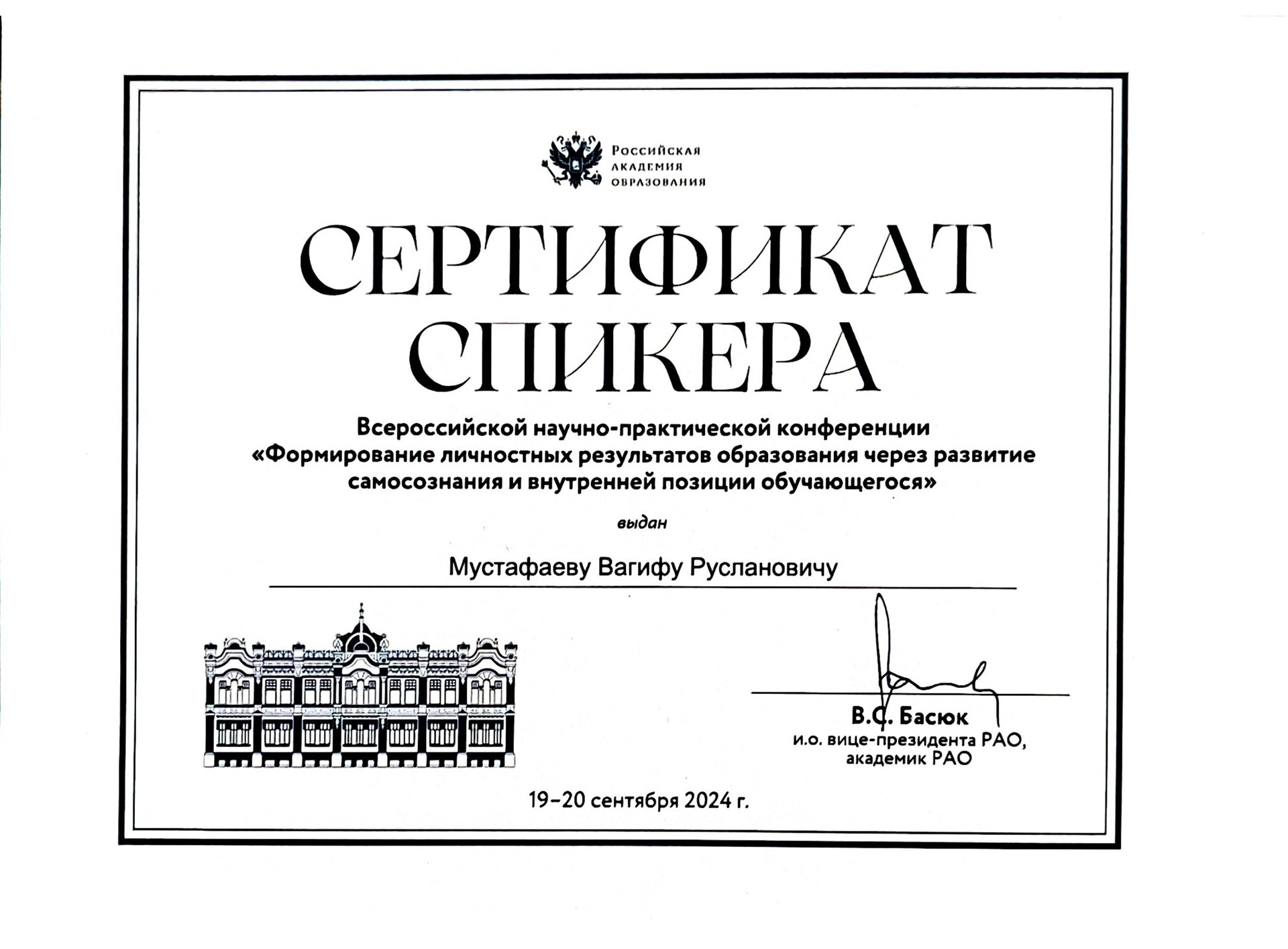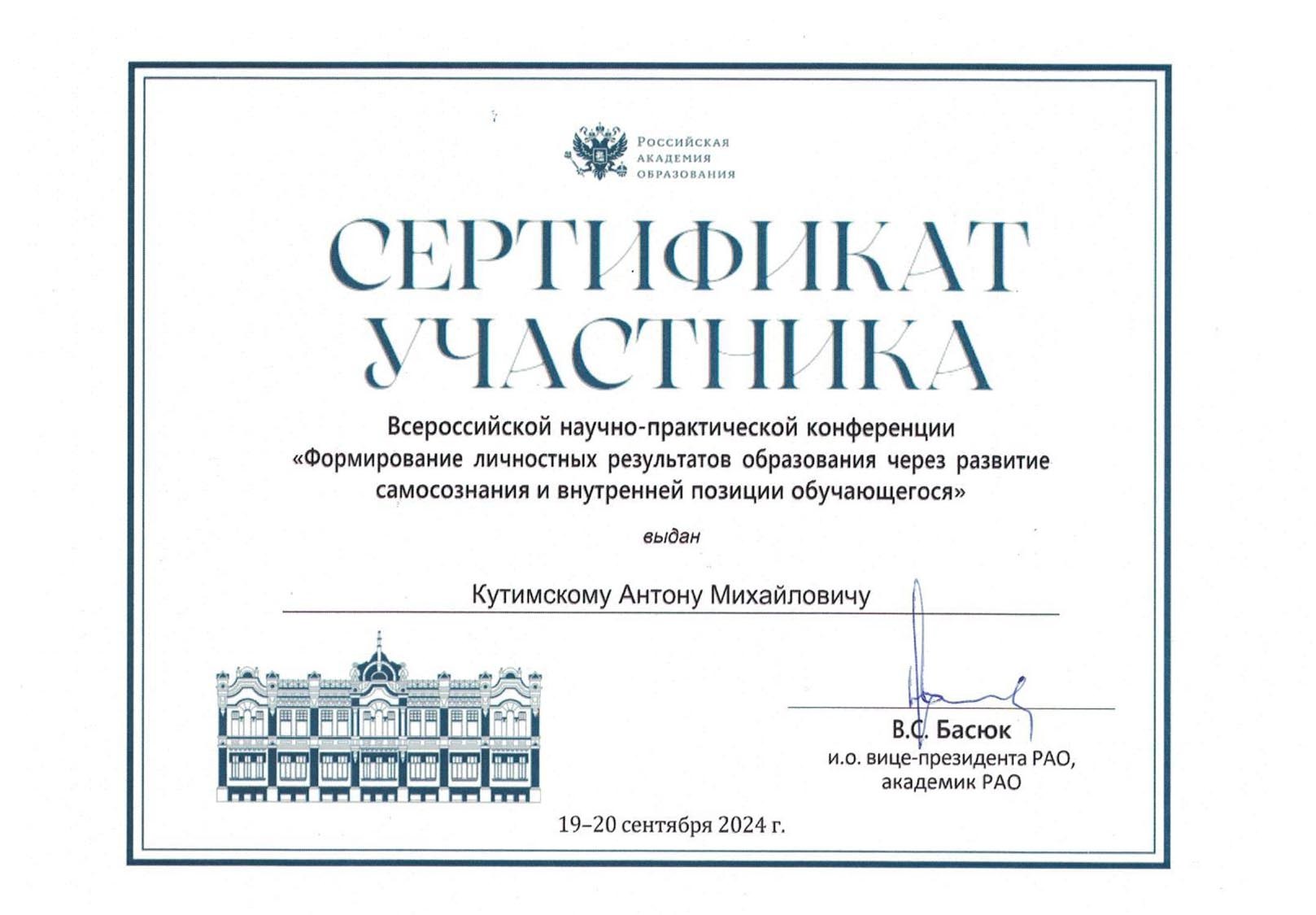 Всероссийская научно-практическая конференция «Формирование личностных результатов образования через развитие самосознания и внутренней позиции обучающегося», г. Москва, 19-20 сентября 2024 года
