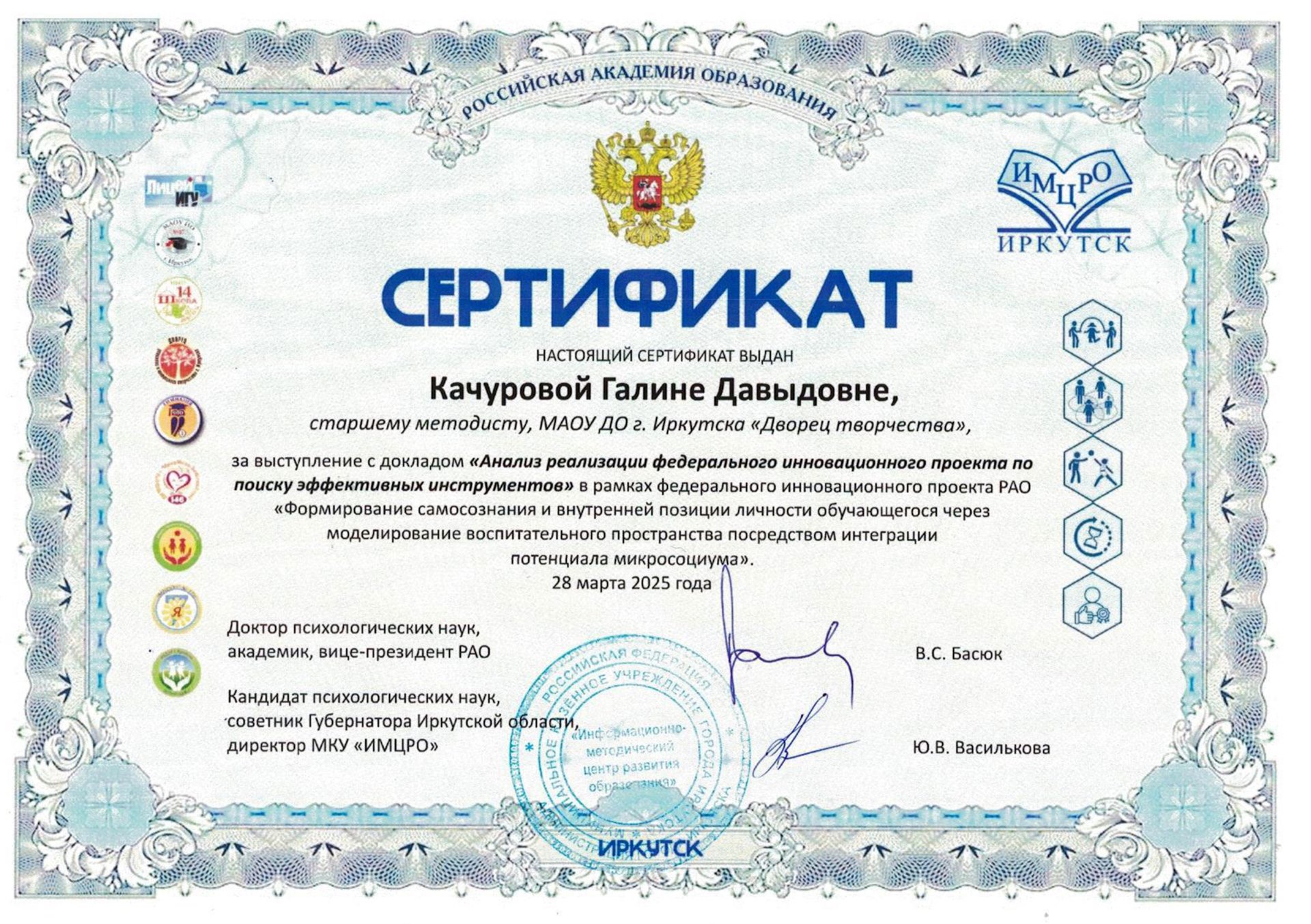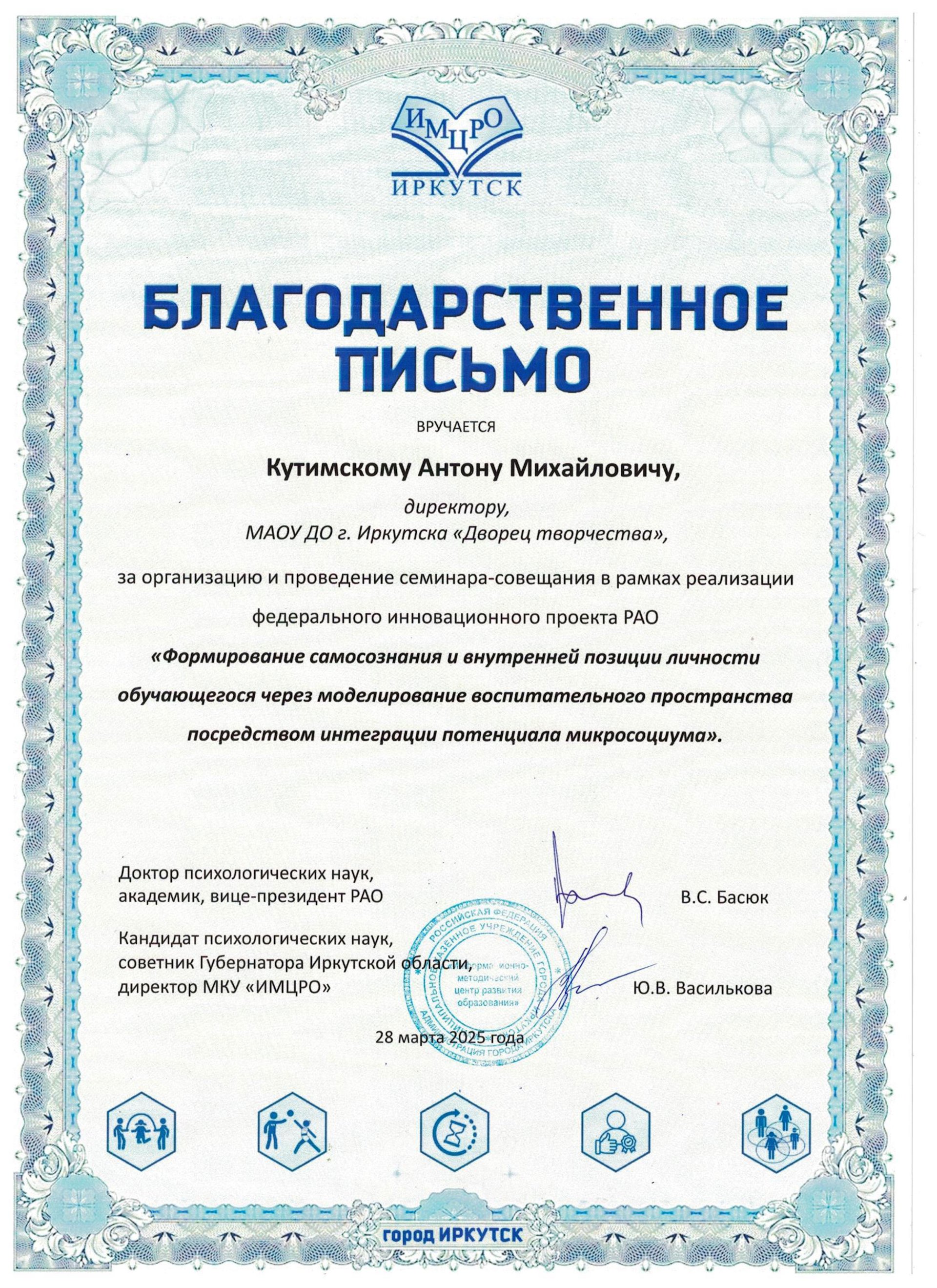 Семинар-совещание в рамках реализации федерального инновационного проекта РАО "Формирование самосознания и внутренней позиции личности обучающегося через моделирование воспитательного пространства посредством интеграции потенциала микросоциума", Иркутск, 28 марта 2025 года